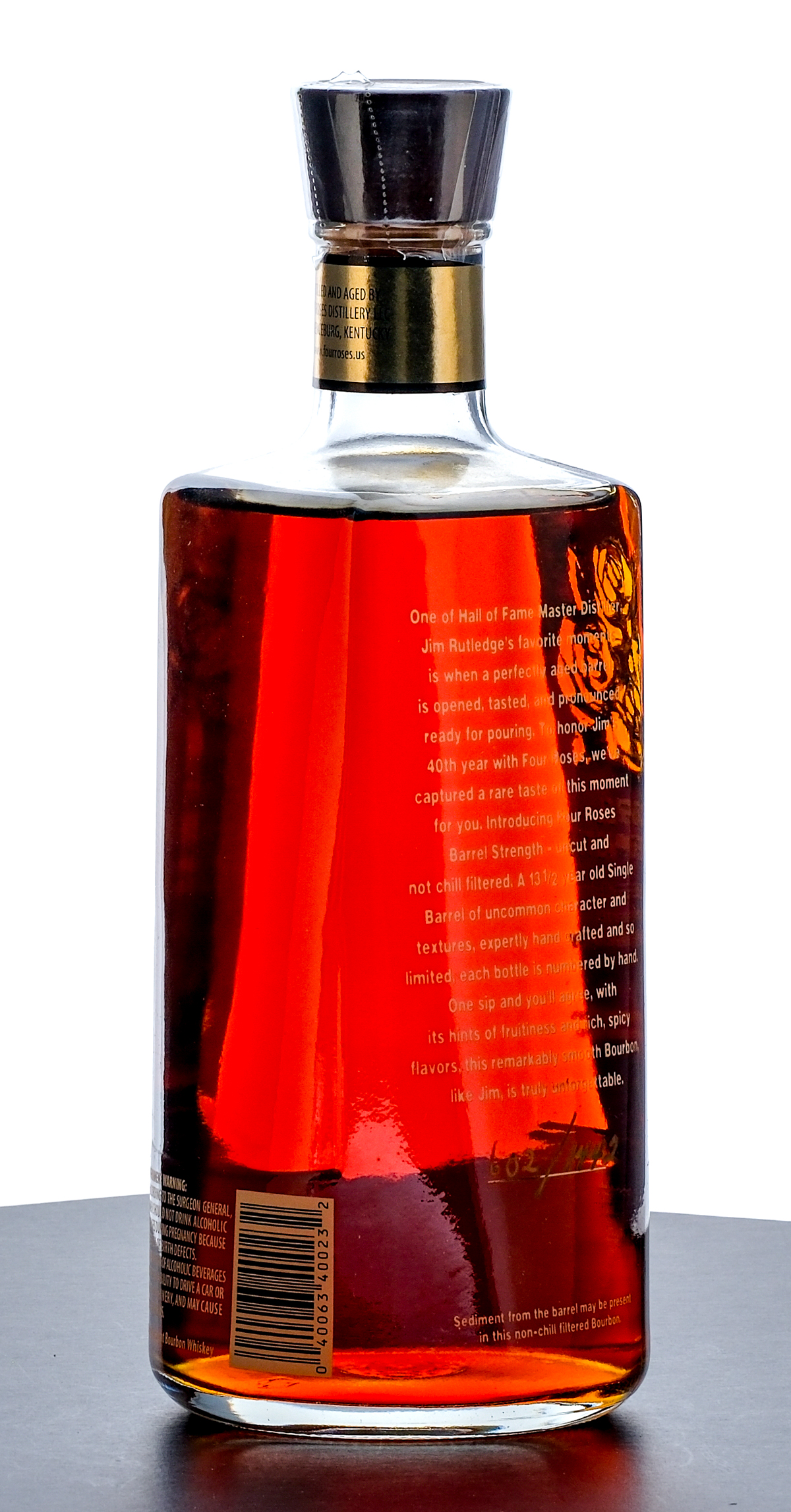 From The Collection of Michael Aronoff: Four Roses Barrel Strength Limited Edition Single Barrel Bourbon Whiskey (2007). 40th; Celebrating Master Distiller Jim Rutledge 40th year with Four Roses. Aged 13.5 years. Warehouse No. 55. Barrel No. 17-1F. Bottle 602/1442. 50.7%ALC/VOL. Plastic seal intact. Screened and printed labels excellent. Distilled and Aged by Four Roses Distillery LLC, Lawrenceburg, Kentucky.