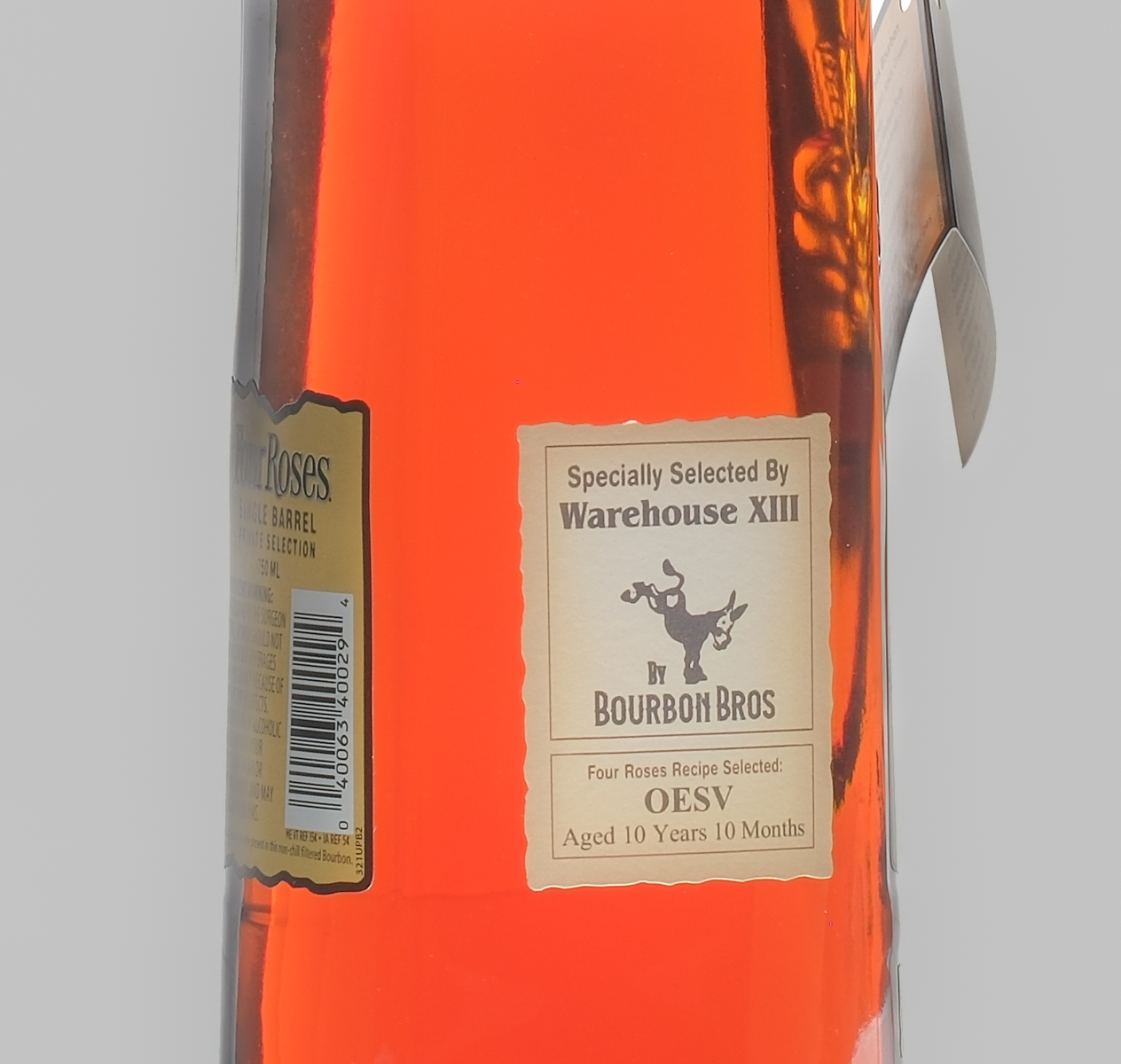 Hang tag intact. Labels, plastic seal and wrap pristine. Specially selected by Warehouse XIII by Bourbon Bros. Four Roses Recipe Selected: OESV (Aged 10 Years, 10 Months). ALC/VOL: 57.2% Warehouse No. PN. Barrel No. 83U. Whiskey Bourbon Four Roses USA Kentucky Unknown 10 Years, 10 Months 1 750ml
