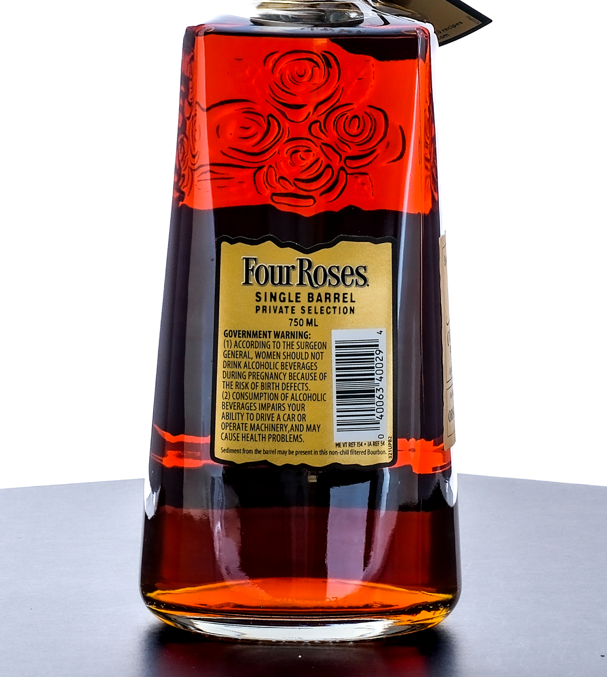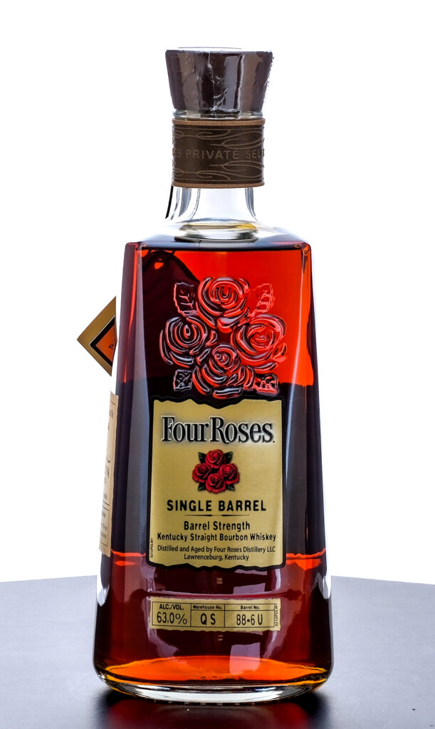 Four Roses Private Selection Single Barrel Barrel Strength Kentucky Straight Bourbon Whiskey. Specially Selected by Conti’s Wines & Spirits. Aged 8 years, 9 months. Four Roses Recipe Selected: OBSK: 60% Corn, 35% Rye, 5% Malted Barley. Warehouse No. QS. Barrel No. 88-6U. Plastic seal and hang tag intact. Printed labels excellent. 750ml. Distilled and Aged by Four Roses Distillery.