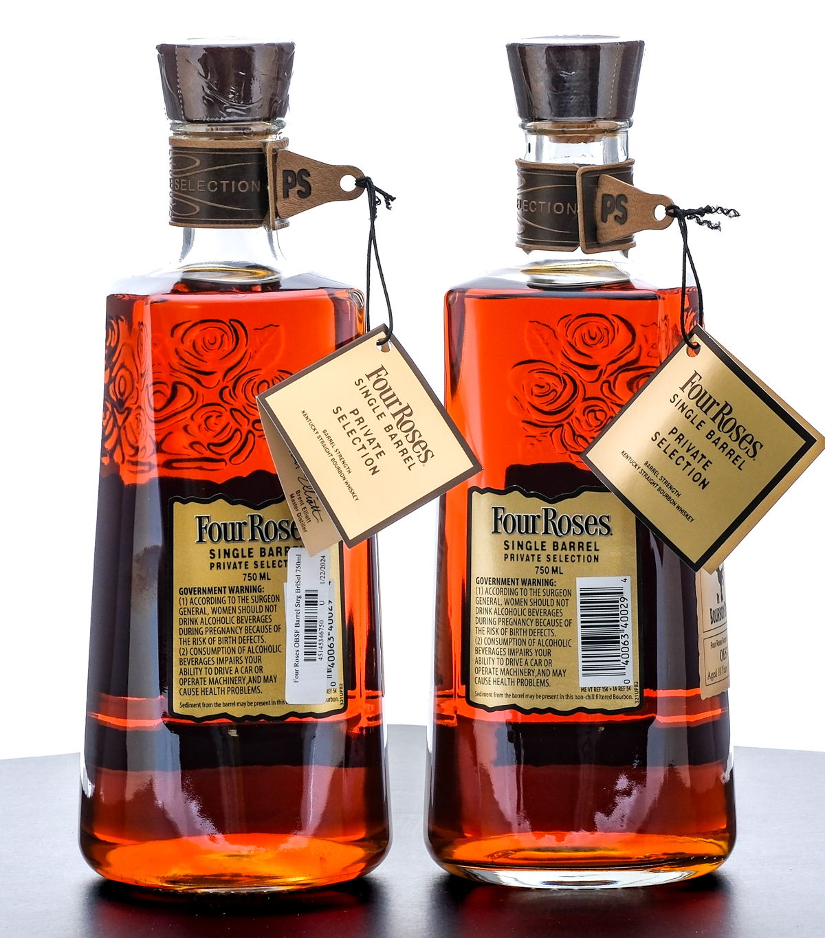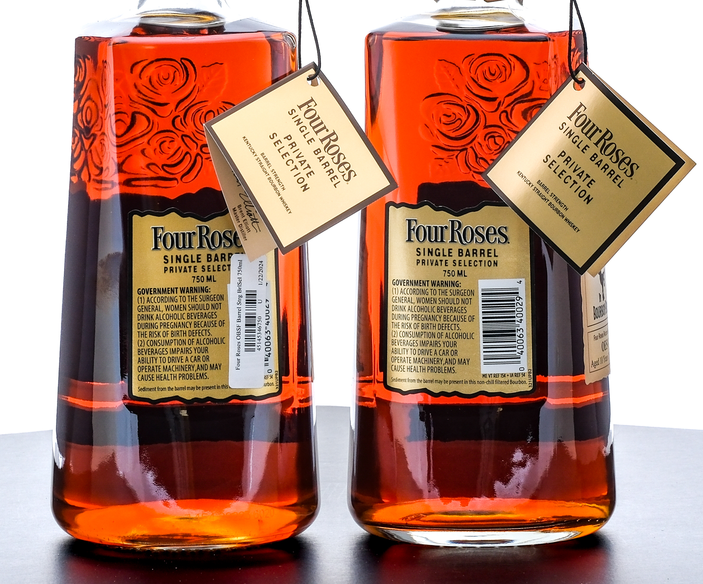 Two Bottles of Four Roses Barrel Strength, Single Barrel, Kentucky Straight Bourbon. 1x: Four Roses Private Selection Single Barrel Barrel Strength Kentucky Straight Bourbon Whiskey. Specially Selected by Warehouse XIII Bourbon Bros. Four Roses Recipe Selected: OESV (Delicate Fruity, Fresh, Creamy). Aged 10 Years 10 Months. Non-Chill Filtered. 57.2% ALC/VOL. Warehouse No. PN. Barrel No. 8.3U. Plastic seal, leather neckless with hangtag intact. Printed labels excellent. 750ml. Distilled and Aged by Four Roses Distillery LLC. Lawrenceburg, Kentucky. 1x: Four Roses Private Selection Single Barrel Barrel Strength Kentucky Straight Bourbon Whiskey. Specially Selected by Total Wine Spirits, Beer & More. October 2023. Four Roses Recipe Selected: OBSF, 60% Corn, 35% Rye, 5% Barley (Mint, Fruit, Spicy, Full Body). Aged 11 Years 6 Months. 58.3% ALC/VOL. Warehouse No.VW. Barrel No. 8-2A. Plastic seal, leather neckless with hangtag intact. Printed labels excellent. 750ml. Distilled and Aged by Four Roses Distillery LLC. Lawrenceburg, Kentucky.