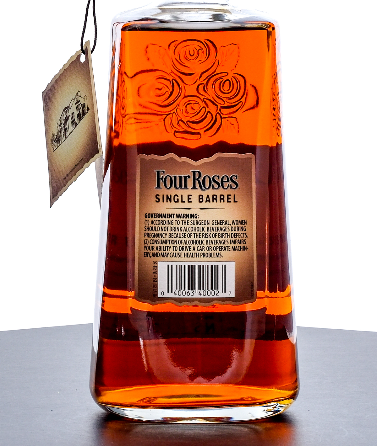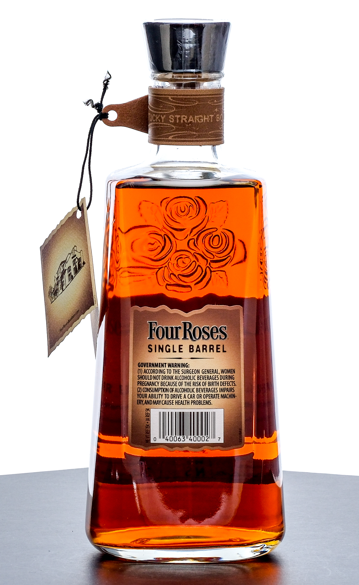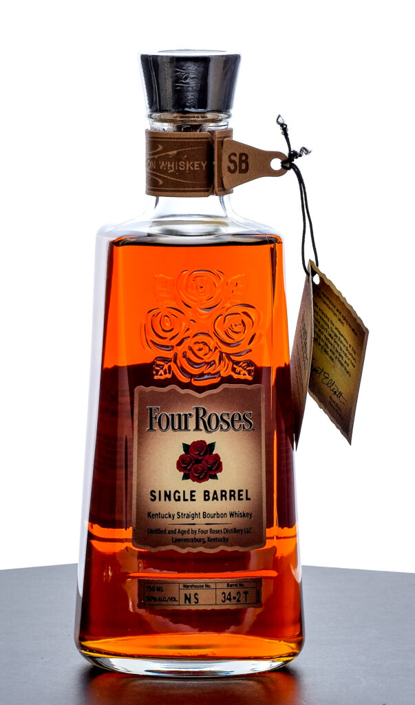 From The Collection of Michael Aronoff: Four Roses Kentucky Straight Bourbon Whiskey Warehouse No. NS. Barrel No. 34-2 T. 50% ALC/VOL (100 Proof). Hang tag intact. Leather decretive strap around bottles neck excellent. Printed labels likewise excellent. 750ml. Distilled and Aged by Four Roses Distillery.
