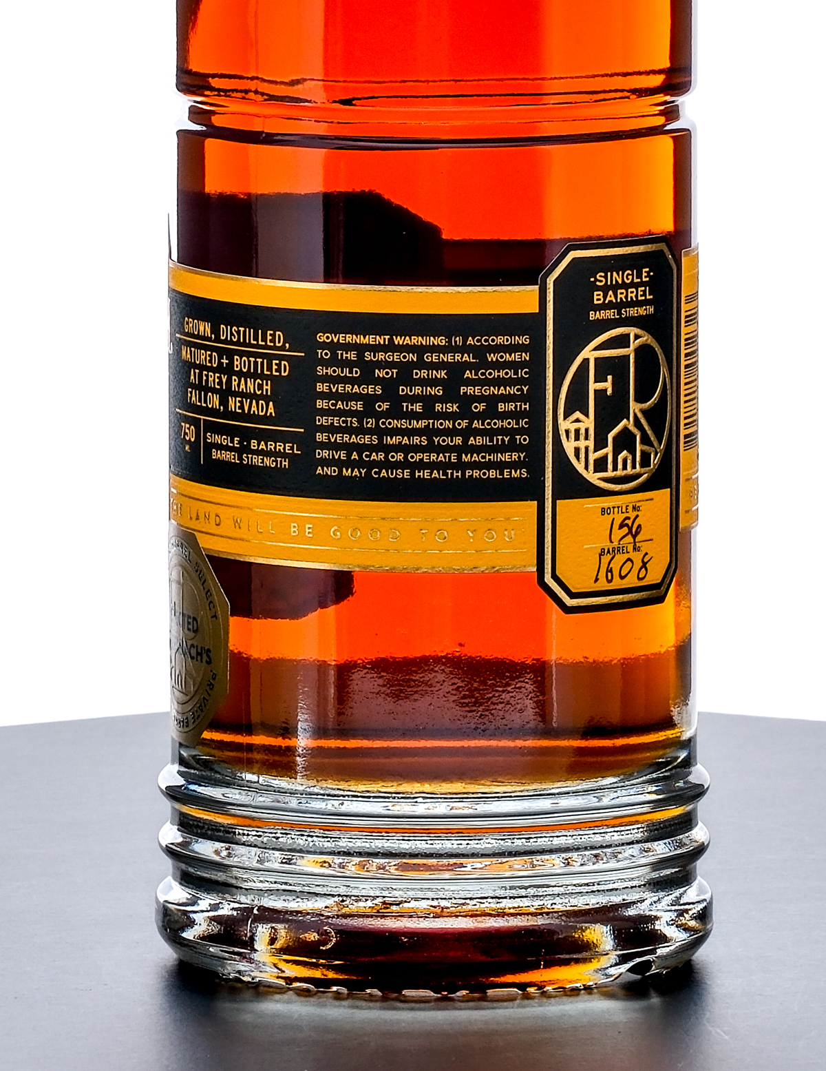 Frey Ranch Farmers + Distillers ” Non Chill Filtered” Single Barrel Straight Bourbon Whiskey. Private Barrel Select, Selected by Seelbach’s. Bottle NO. 156 Barrel NO.1608. 61.72%ALC/VOL (123.44 proof) Plastic seals intact. Printed labels Excellent. 750ml. Grown, Distilled, Matured + Bottled at Frey Ranch Distillery, Fallon, Nevada.