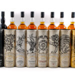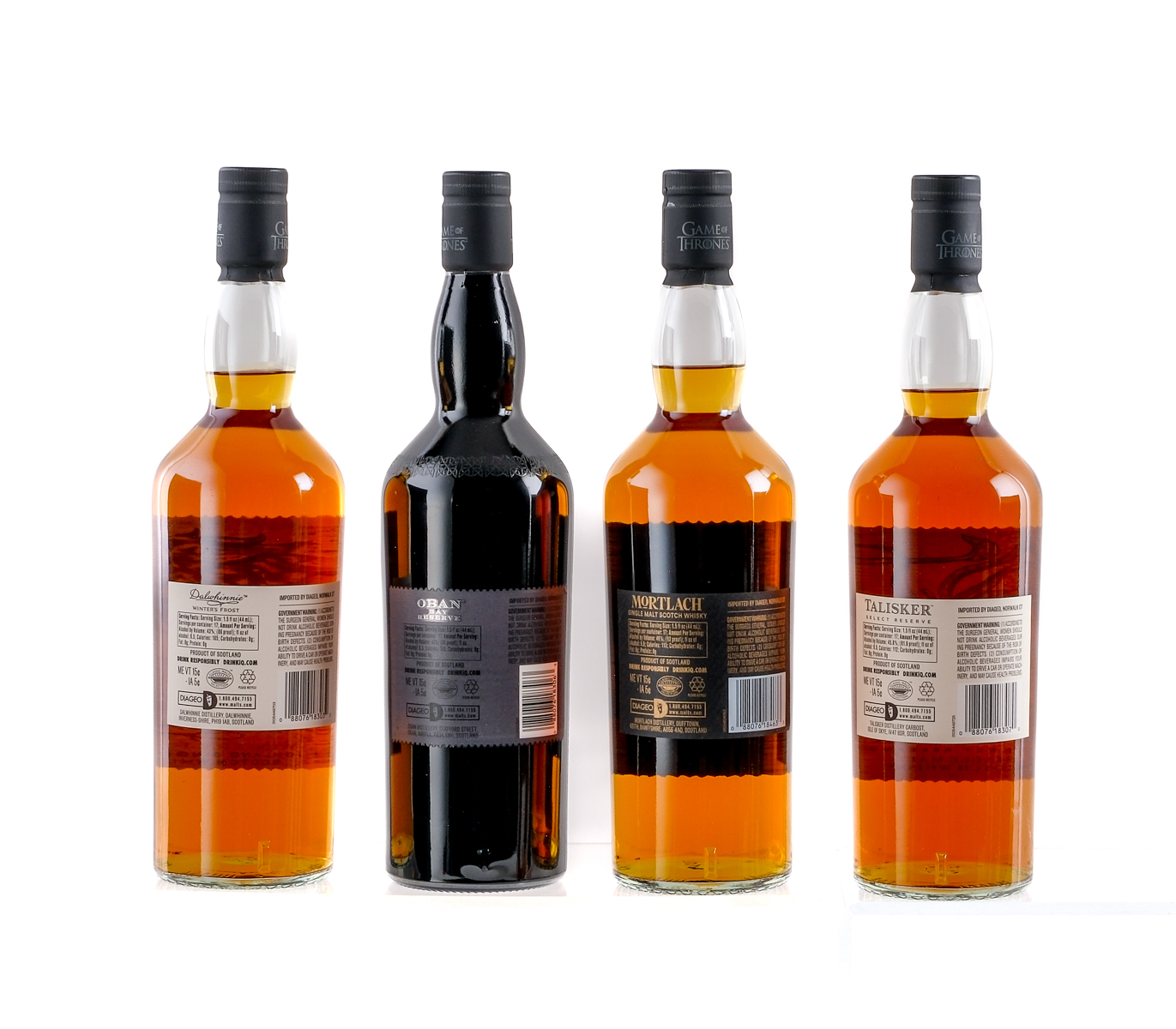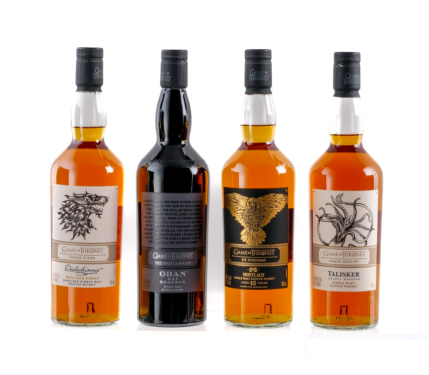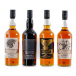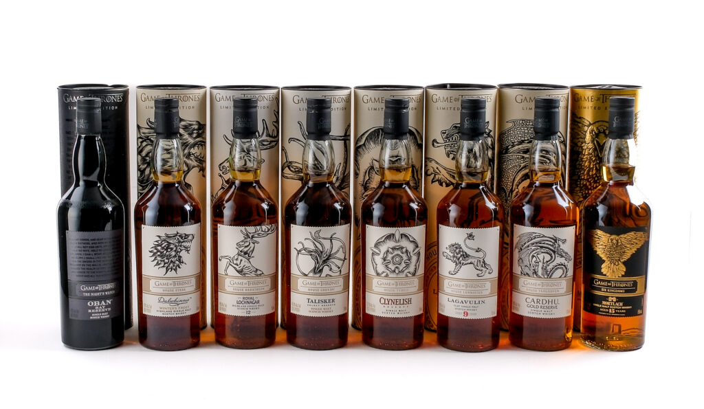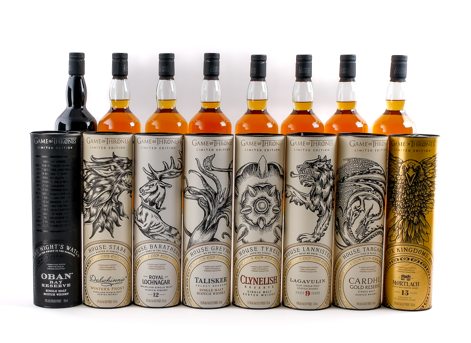 Group of 8 Limited Edition GoT themed bottles: 1x House Targaryen Cardhu Gold Reserve (40% ALC/VOL, 80 Proof), 1x House Stark Dalwhinnie Winter’s Frost Highland Single Malt Scotch Whisky (43% ALC/VOL, 86 Proof), 1x House Lannister Lagavulin Islay Single Malt Scotch Whisky (Aged 9 Years, 46% ALC/VOL, 92 Proof), 1x House Tyrell Clynelish Reserve (51.2% ALC/VOL, 102.4 Proof), 1x House Baratheon Royal Lochnager Highland Single Malt Whisky (Aged 12 Years, 40% ALC/VOL, 80 Proof), 1x House Greyjoy Talisker Select Reserve (45.8% ALC/VOL, 91.6 Proof), 1x The Night’s Watch Oban Bay Reserve (43% ALC/VOL, 86 Proof), and 1x Six Kingdoms Mortlach (Aged 15 Years, Finished in Ex-Bourbon Casks, 46% ALC/VOL, 92 Proof). Original carboard and tin tubes in largely excellent condition. Some imperfections evident. Labels and foils excellent. Only MIssing House Tully, Singleton. Whiskey Scotch Diageo Scotland Various 8 750ml