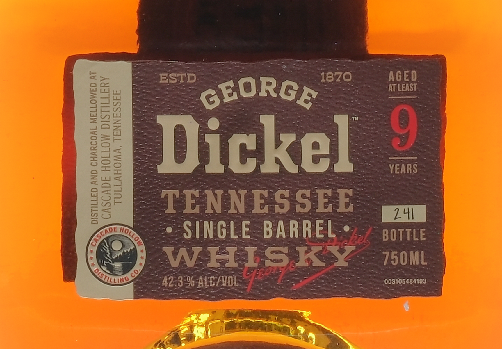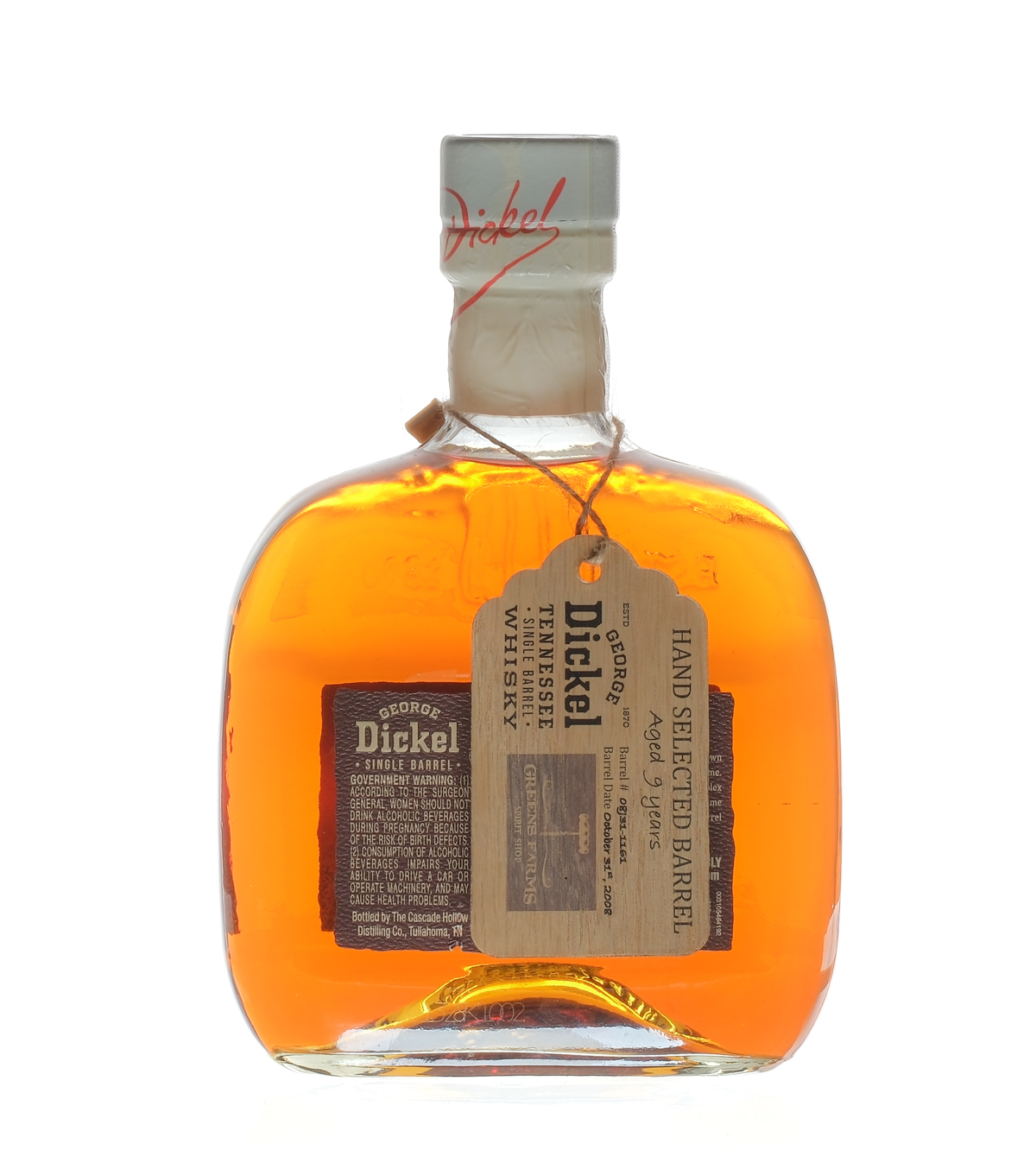 Hand Selected Barrel. Selection by Greens Farms Spirit Shop. Barrel 08J31-1161. Barrel Date October 31st, 2008. Bottle 241. 42.3% ALC/VOL. Hang tag intact. Labels and foil excellent. Whiskey George Dickel USA Tennessee 2017 Aged 9 Years 1 750ml