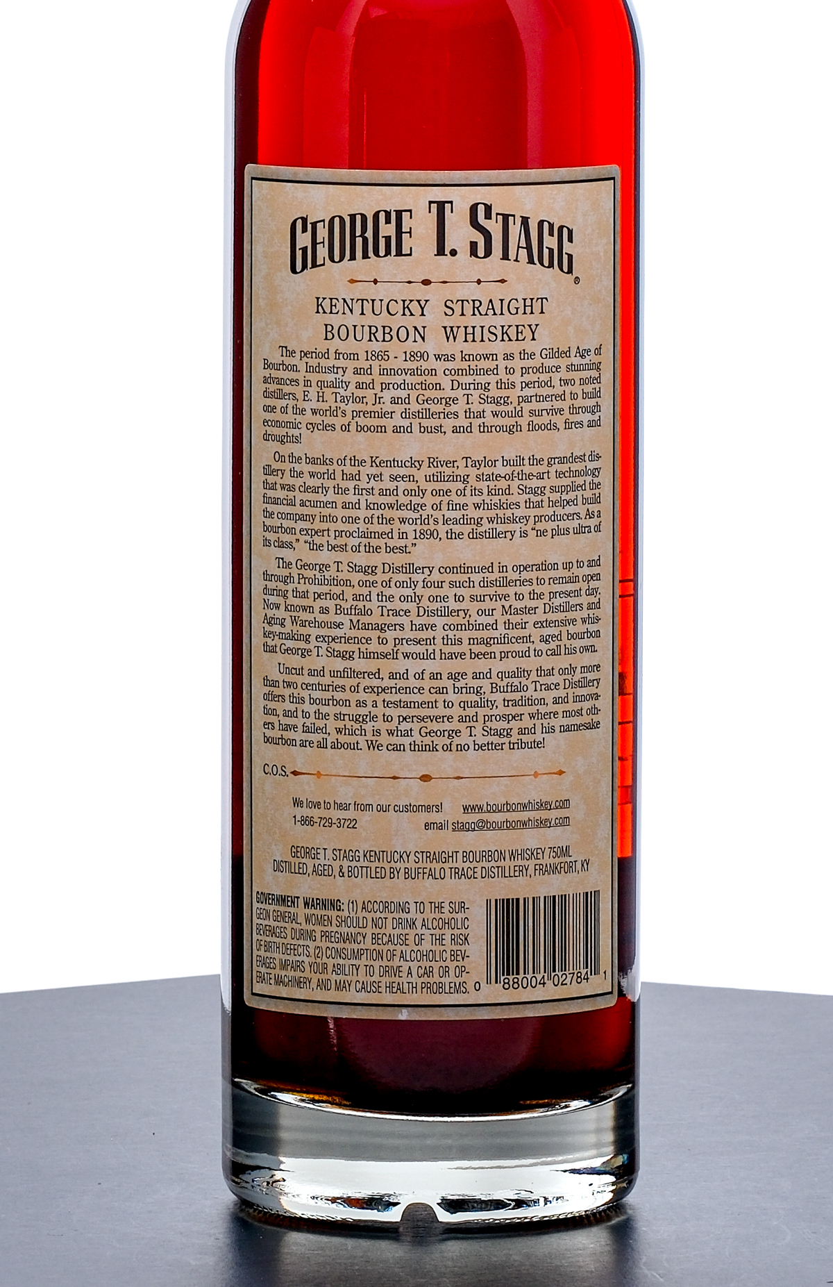 From The Collection of Michael Aronoff: George T. Stagg Hazmat II Barrel Proof Kentucky Straight Bourbon Whiskey (Fall 2005). Limited Edition, 70.6% ALC/VOL (141.2 Proof). Whisky Advocate Neck wraparound intact with a rating of “93” with hand written notes conveying the alcohol content and bottling year. Foil seal very good, exhibition some color loss on top. Screened and printed labels excellent. 750ml. Distilled, aged & bottled by Buffalo Trace Distillery.