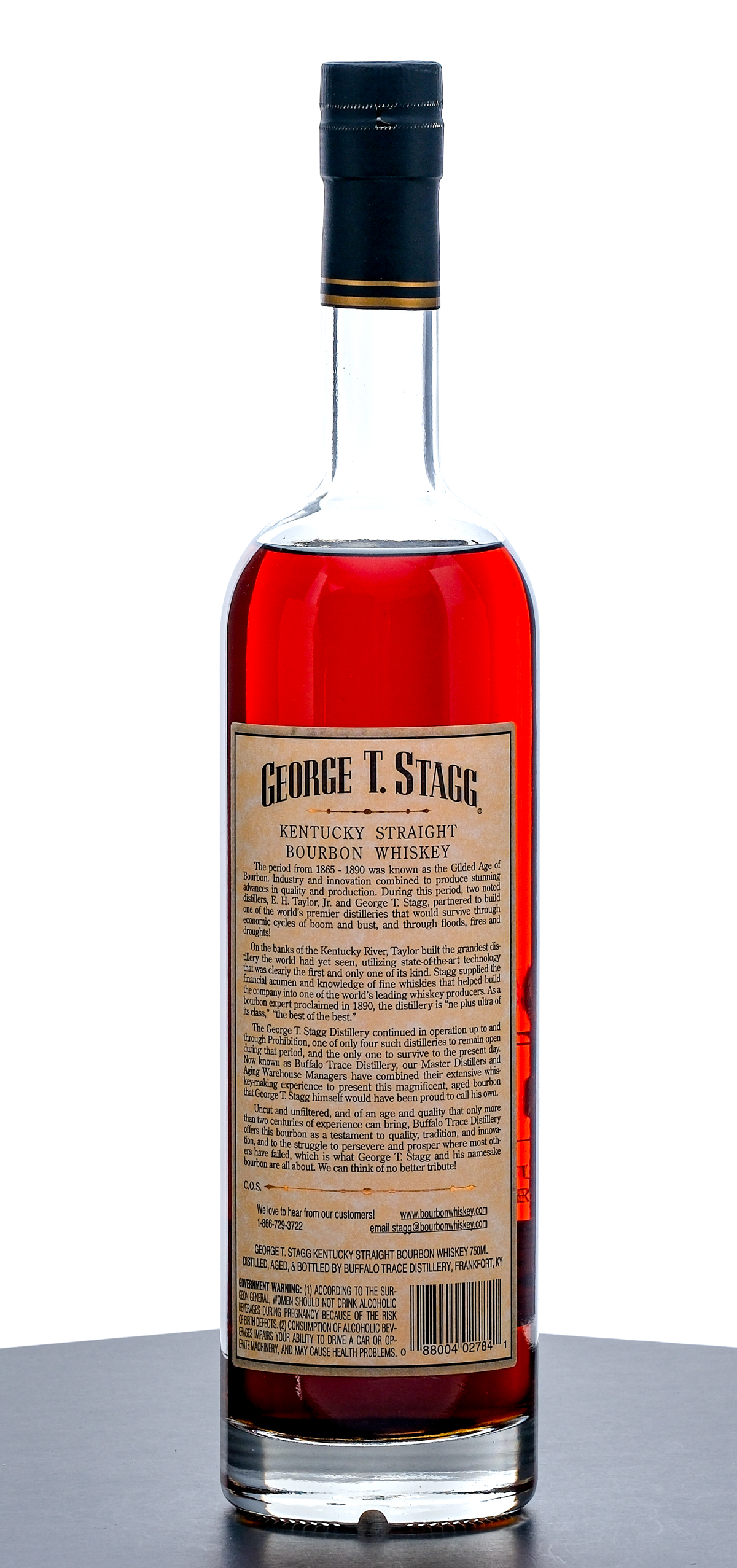 From The Collection of Michael Aronoff: George T. Stagg Hazmat Barrel Proof 15 year Kentucky Straight Bourbon Whiskey (2008). Limited Edition, 70.9% ALC/VOL (141.8 Proof). Foil seal very good, exhibits some minor color loss from shelf wear. Screened and printed labels excellent. 750ml. Distilled, aged & bottled by Buffalo Trace Distillery.