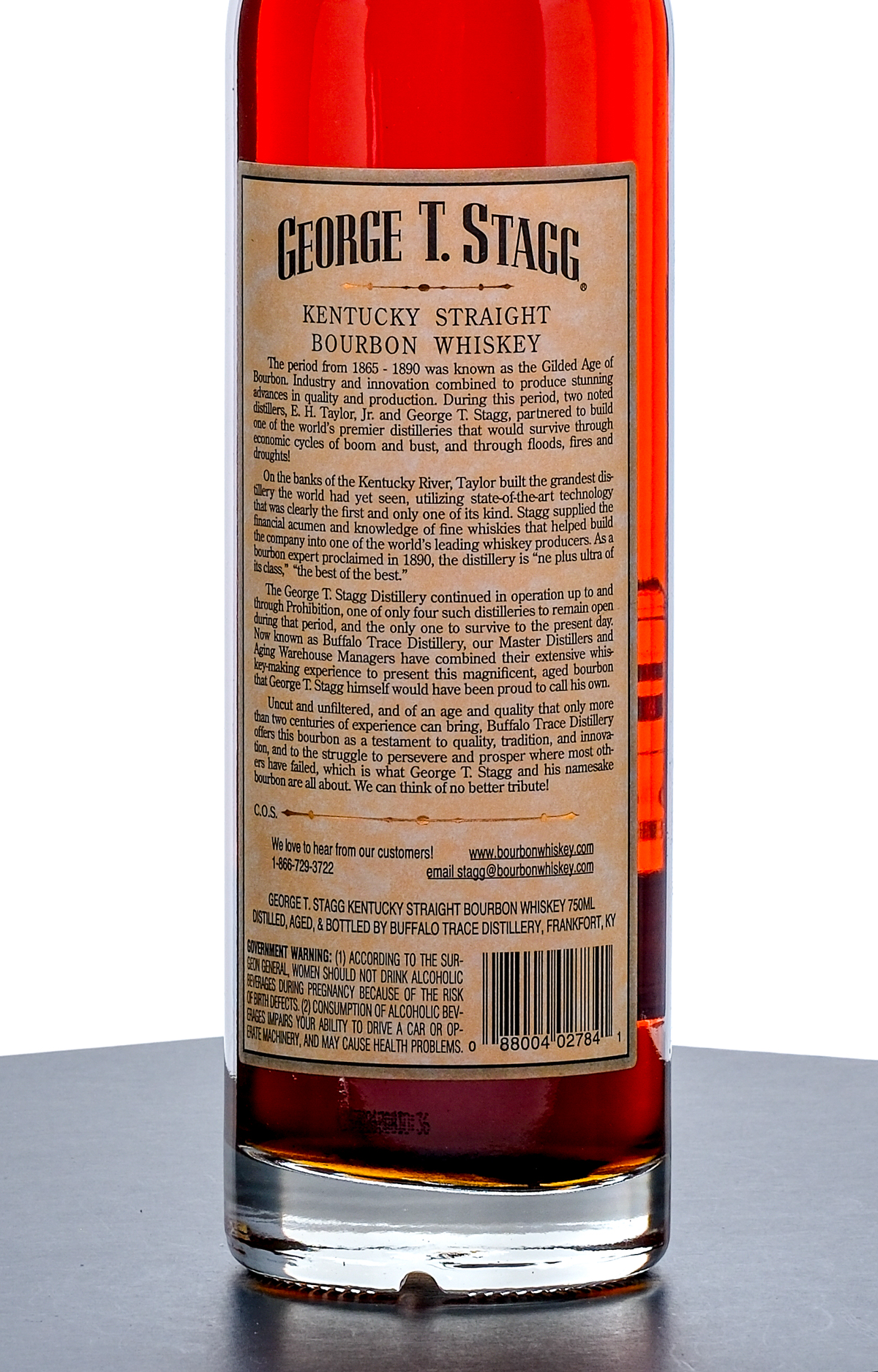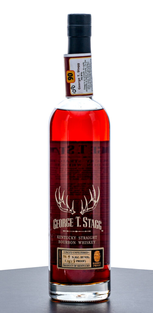 From The Collection of Michael Aronoff: George T. Stagg Hazmat Barrel Proof 15 year Kentucky Straight Bourbon Whiskey (2008). Limited Edition, 70.9% ALC/VOL (141.8 Proof). Malt Advocate Score “90” wraparound on neck intact (with handwritten notes). Foil seal very good, exhibits some minor color loss from shelf wear. Screened and printed labels excellent. 750ml. Distilled, aged & bottled by Buffalo Trace Distillery.