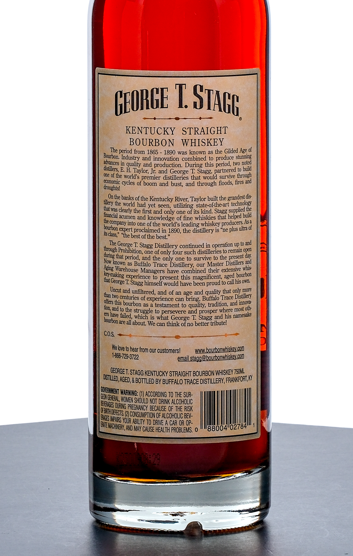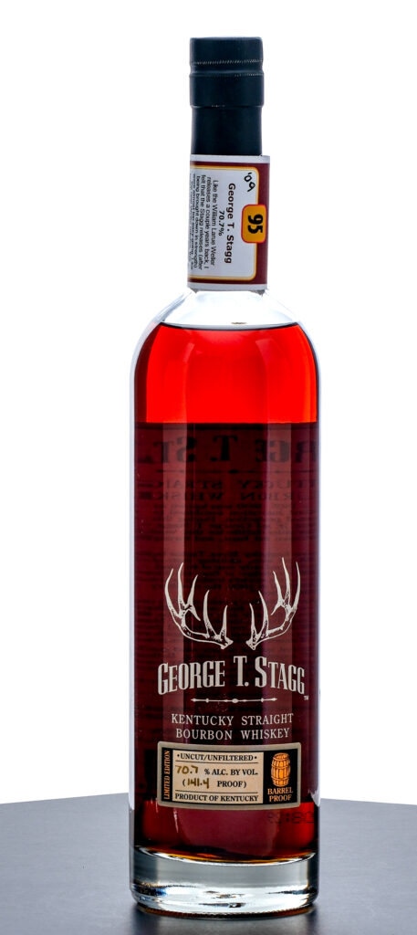 From The Collection of Michael Aronoff: George T. Stagg Hazmat Barrel Proof 16 year Kentucky Straight Bourbon Whiskey (2009). Limited Edition, 70.7% ALC/VOL (141.4 Proof). Malt Advocate Score “95” wraparound on neck intact (with handwritten notes) Foil seal very good, exhibits some minor color loss from shelf wear. Screened and printed labels excellent. 750ml. Distilled, aged & bottled by Buffalo Trace Distillery.