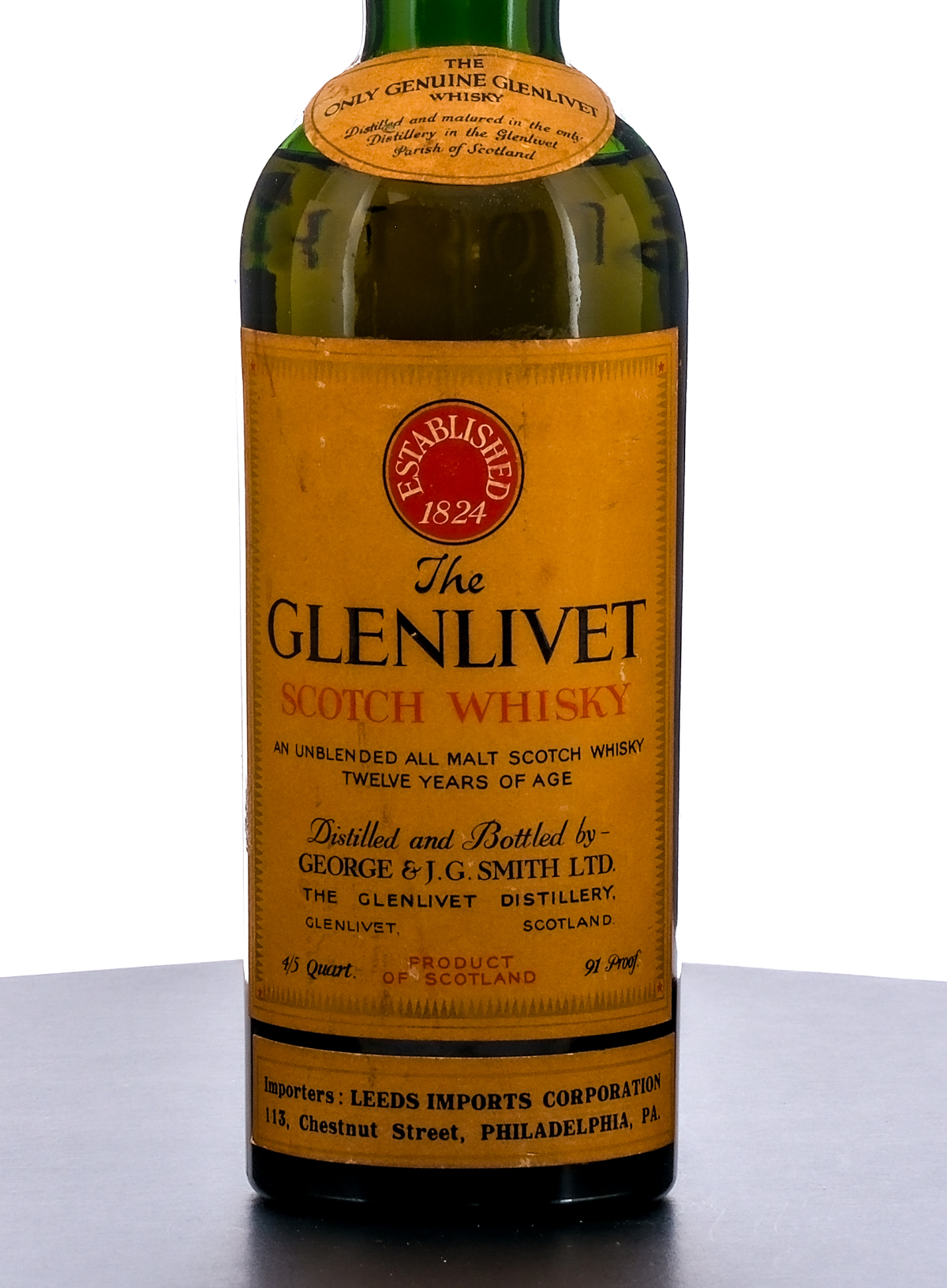 The Genlivet 12 Year Scotch Whisky. Believed Circa 1961-1977 (based on tax stamp). 91 Proof. Foil seal excellent. Overlaid tax stamp exhibits substantial losses. Printed labels very good considering their age (some staining and discoloration present) 4/5 of a quart. Distilled and bottled by George & J.G. Smith Ltd. Importers: Leeds Imports Corporation, 113, Chestnut St, Philadelphia, PA.