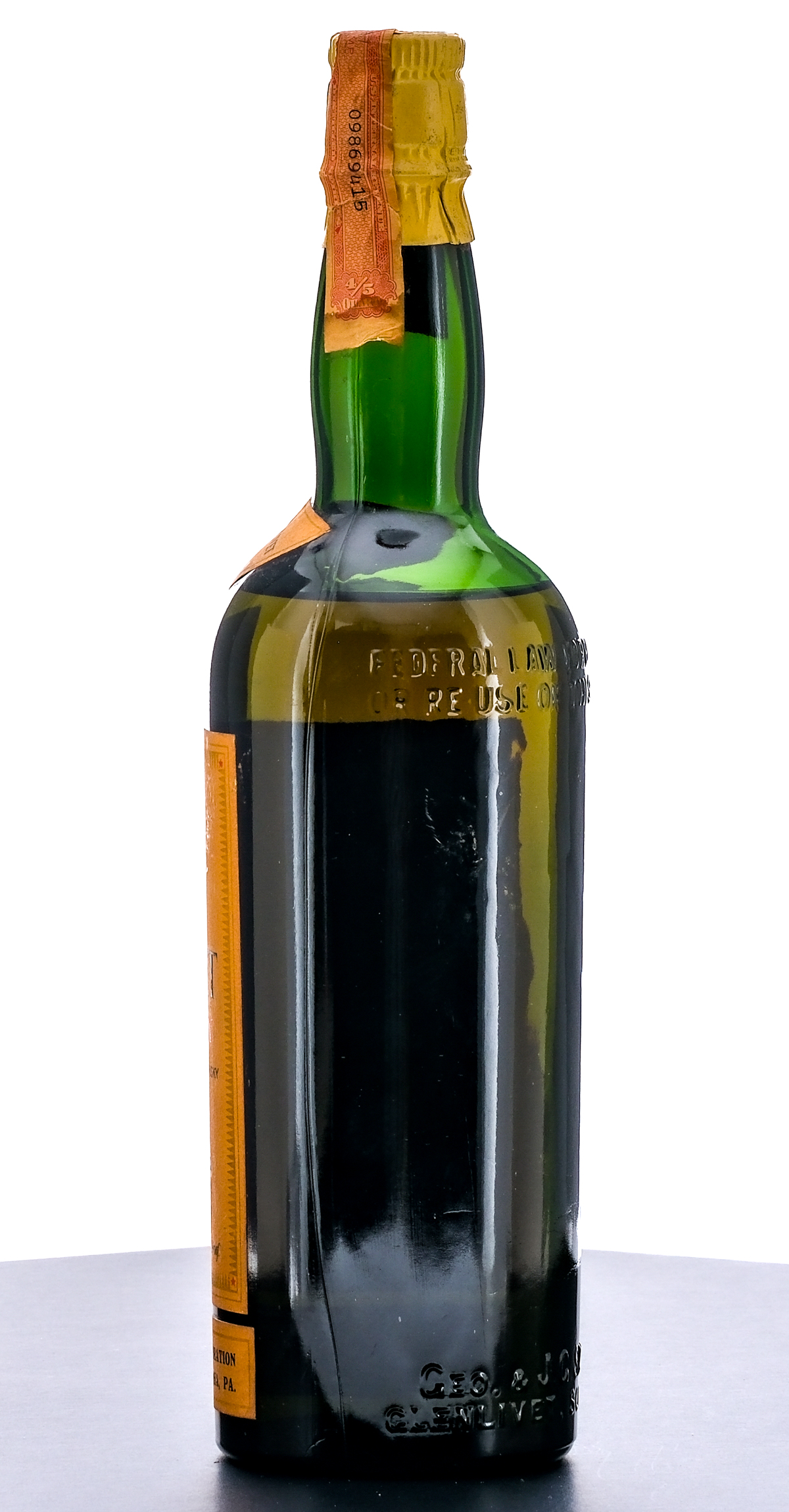 The Genlivet 12 Year Scotch Whisky. Believed Circa 1961-1977 (based on tax stamp). 91 Proof. Foil seal excellent. Overlaid tax stamp exhibits substantial losses. Printed labels very good considering their age (some staining and discoloration present) 4/5 of a quart. Distilled and bottled by George & J.G. Smith Ltd. Importers: Leeds Imports Corporation, 113, Chestnut St, Philadelphia, PA.