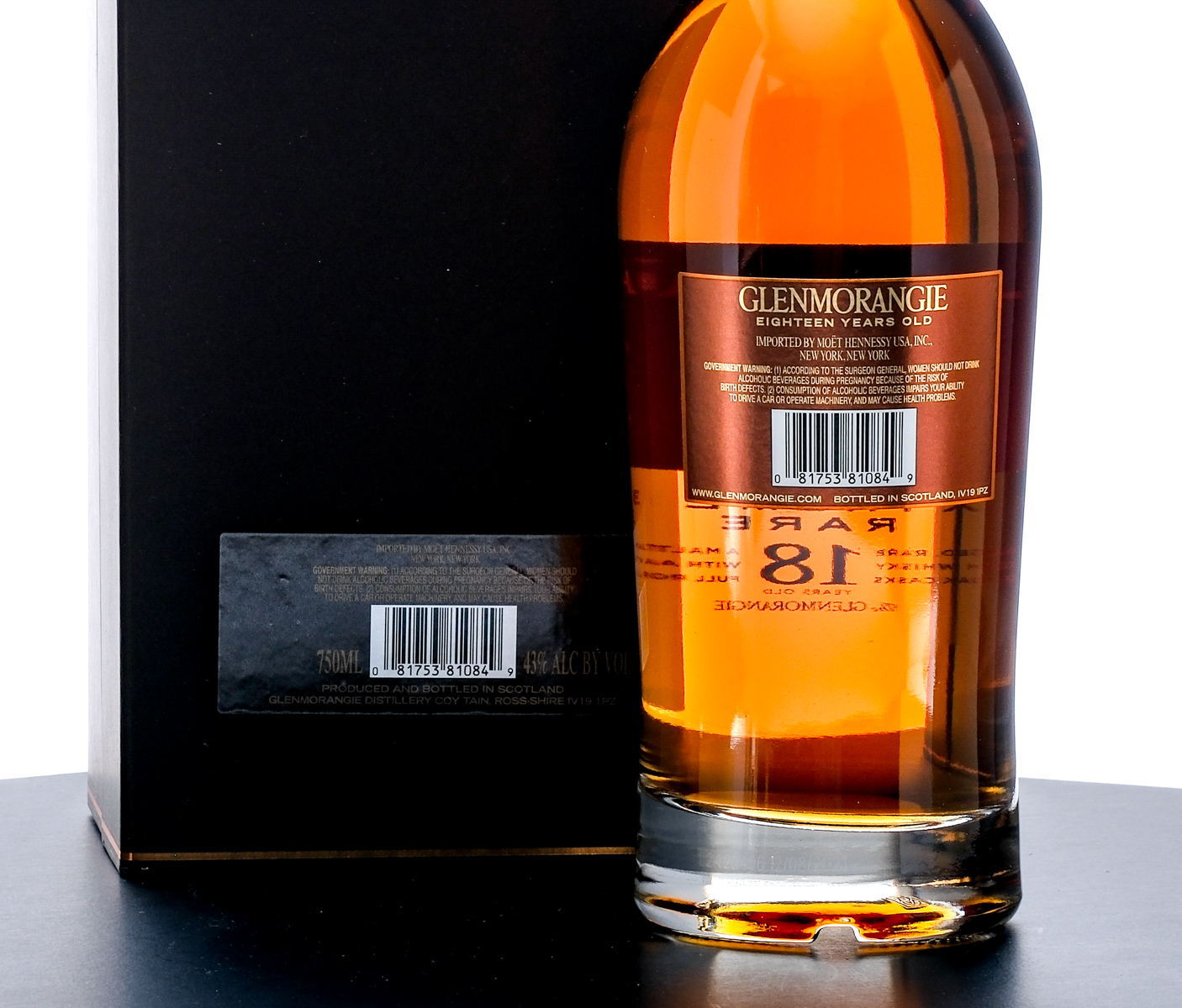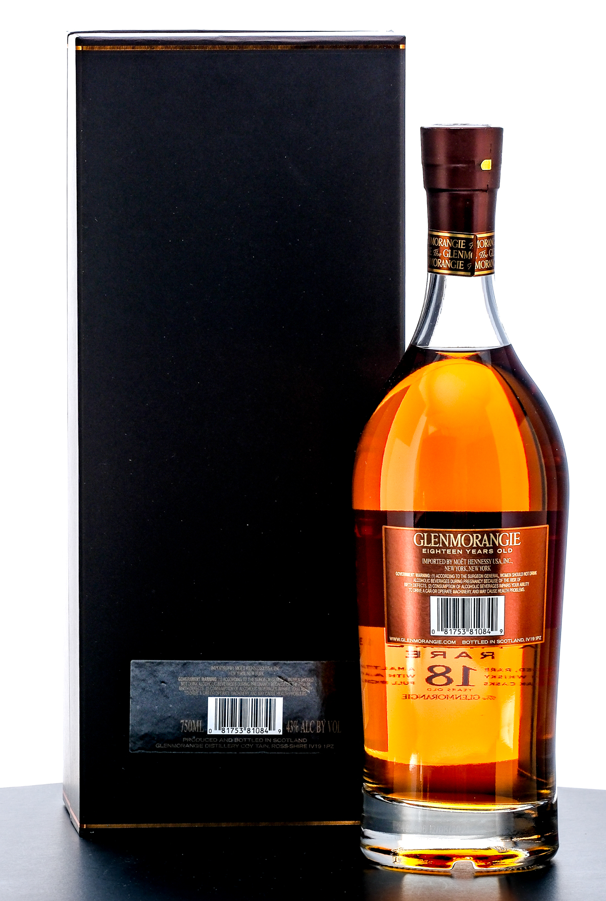 The Glenmorangie 18 Year Extremely Rare Highland Single Malt Scotch Whisky. Specially aged, rare Malt Scotch Whisky matured in Oak casks. 43% ALC/VOL.Cardboard presentation box excellent. Foil seal and screened and printed labels on bottle likewise excellent. 750ml. Imported by Moet Hennessy USA Inc. (New York, NY).
