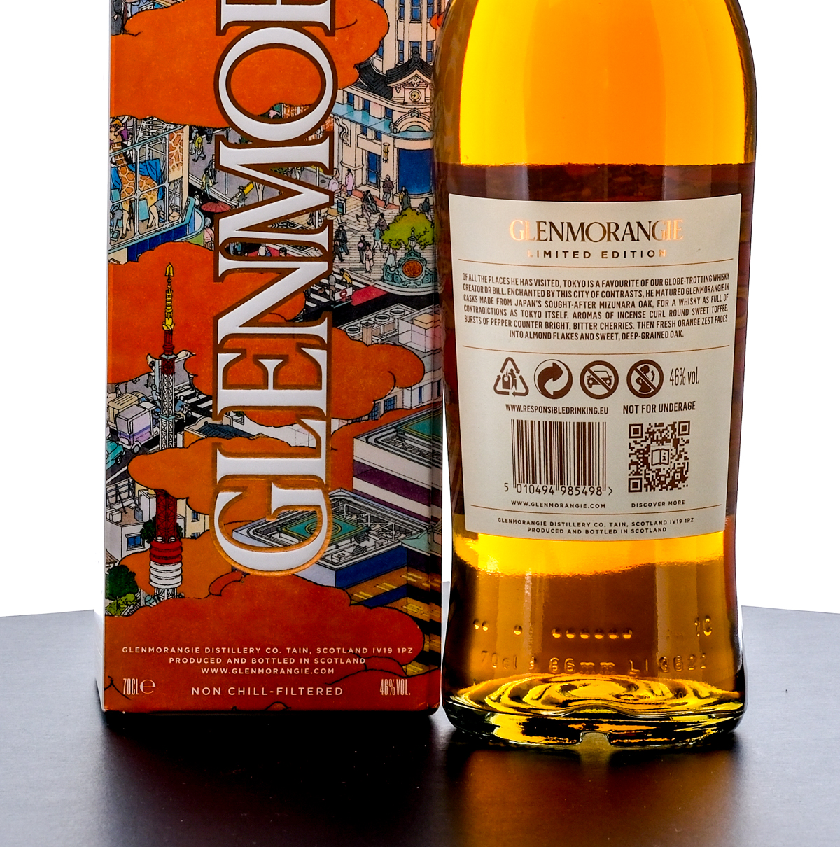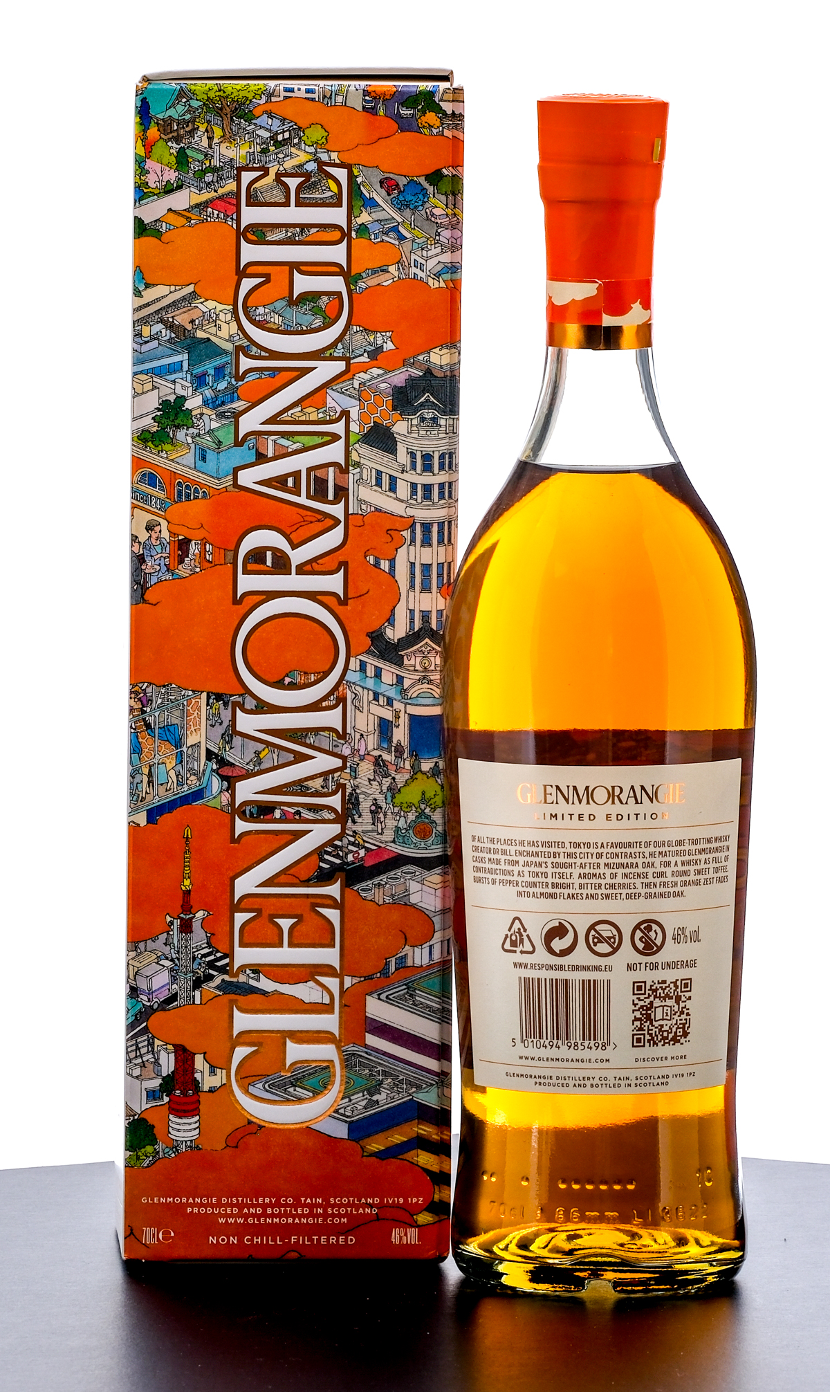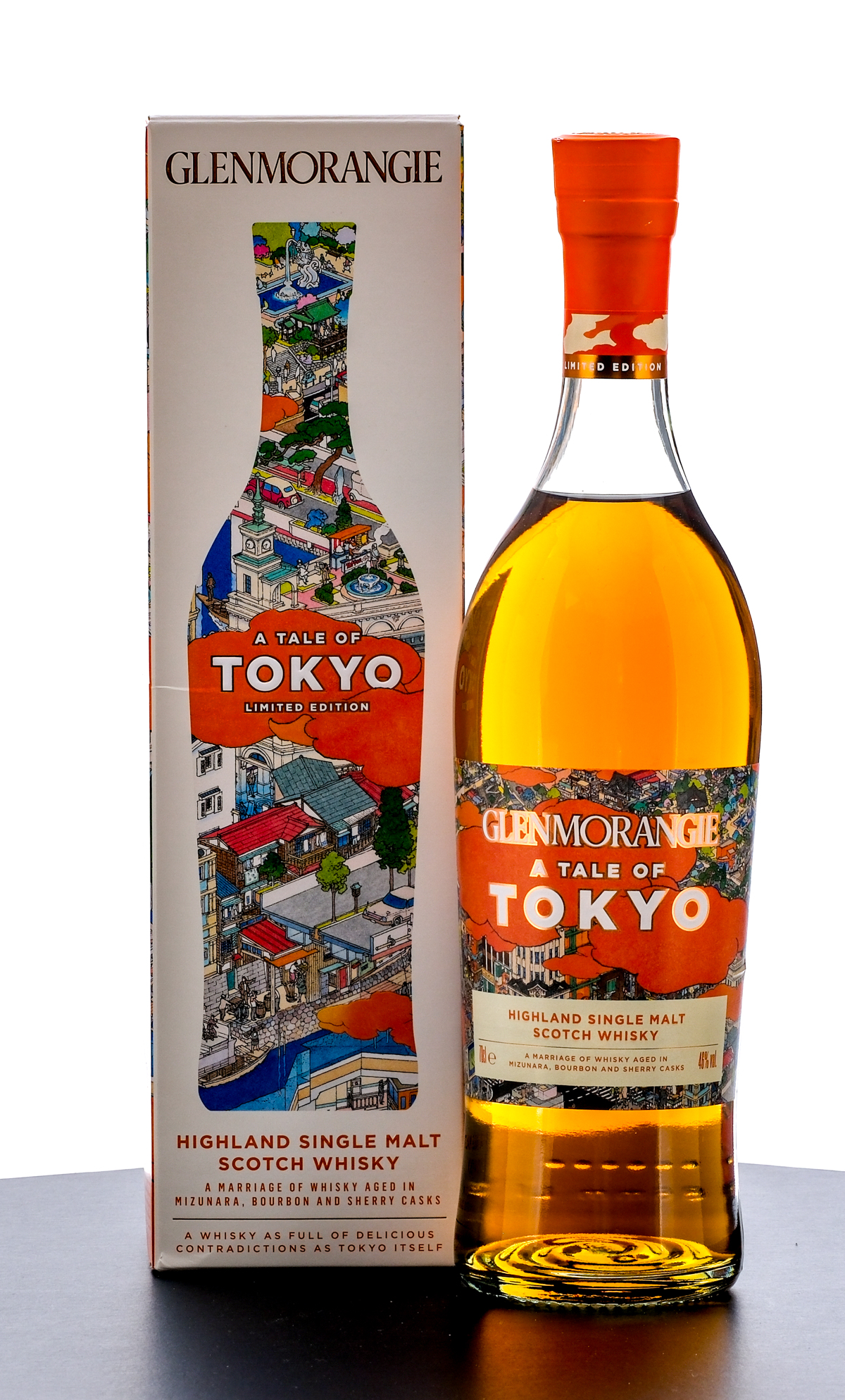 Glenmorangie “A Tale of Tokyo” Highland Single Malt Scotch Whisky (2024). Limited Edition. A marriage of Whisky aged in Mizunara, Bourbon and Sherry casks. 46% ALC/VOL. Carboard box very good (with minor creasing on two panels and on the flap beneath the lid). Art by Akira Yamaguchi. Foil seal on bottle excellent. Printed labels likewise excellent. 70cl. Produced and bottled by Glenmorangie Distillery Co.