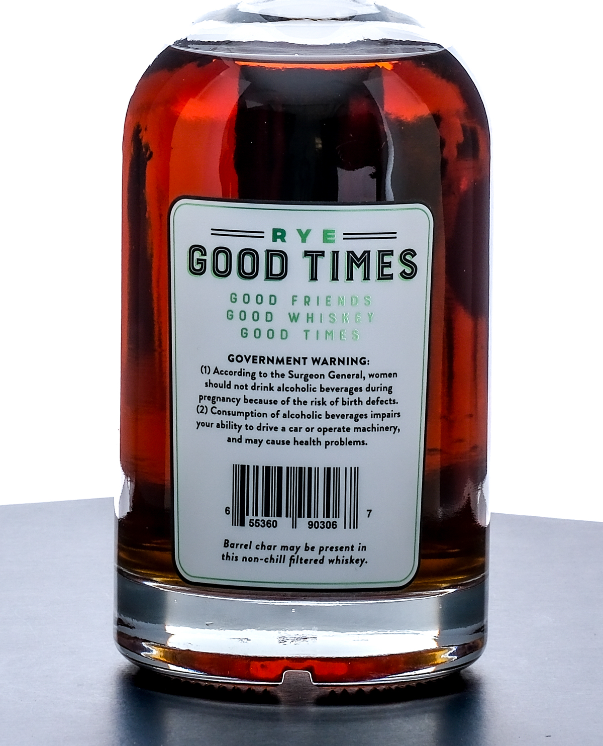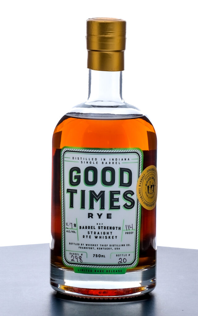 Good Times Single Barrel Barrel Strength Straight Rye Whiskey. Limited Rare Release. Finished in toasted White Oak and Bourbon Caramel barrels. Hand selected by Good Spirits Wine & Tobacco. Barrel No. 298. Bottle No. 27. 57% ALC./Vol. (114 Proof). Foil seal excellent. Printed labels likewise excellent. 750ml. Distilled in Indiana. Bottled by Whiskey Thief Distilling Co. (Frankfort, KY). Barrel char may be present in this non-chill filtered whiskey.