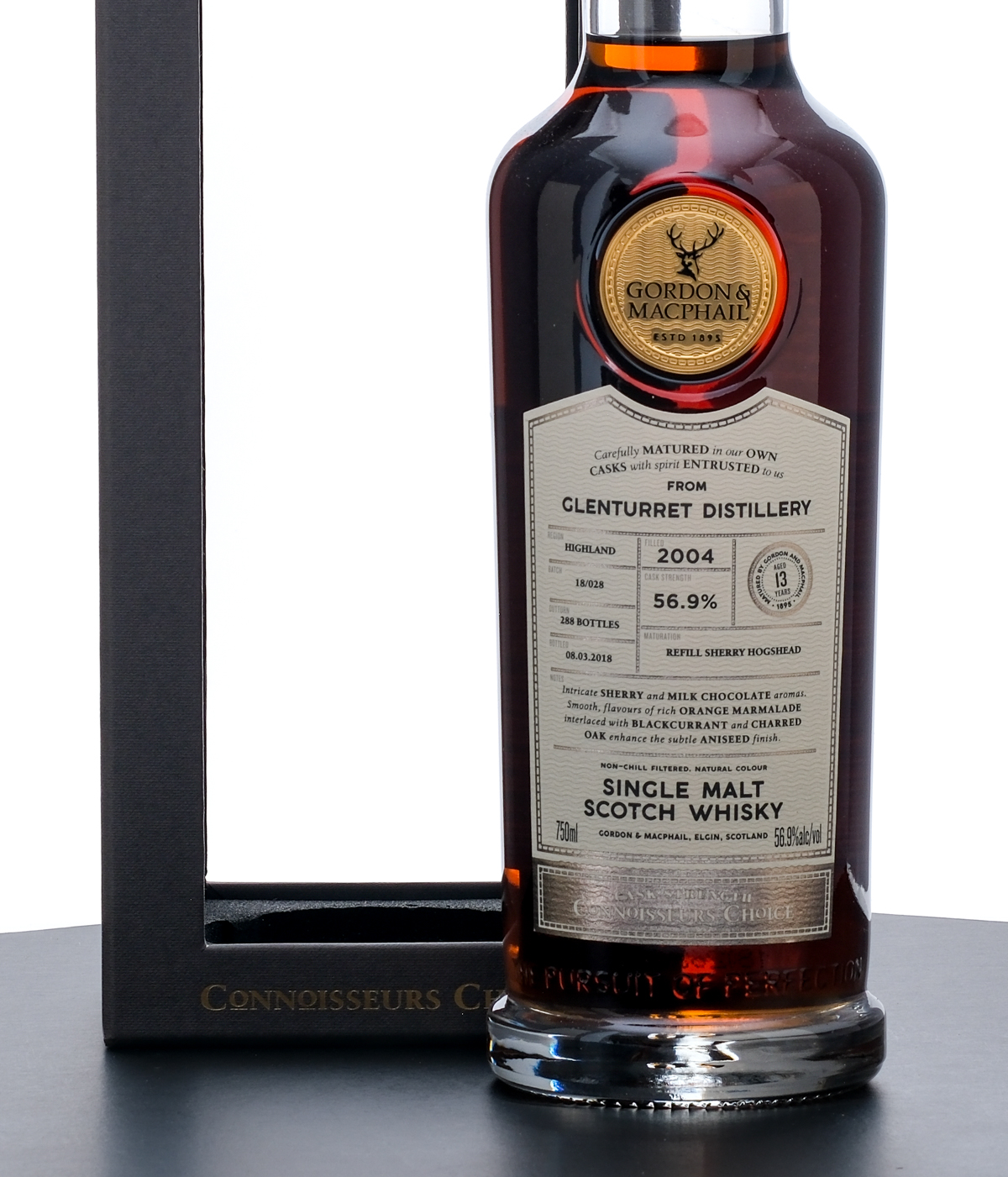 Gordon & MacPhail Connoisseur’s Choice Cask Strength Single Malt Scotch. “Carefully matured in our own casks with spirit entrusted to us from Glenturret Distillery.” Filled: 2004. Bottled: 08.03.2018. Region: Highland. Batch: 18/028. Outturn: 288 bottles. Maturation: refill Sherry Hogshead. Cask strength: 56.9% ALC/VOL. Cardboard presentation box excellent. Foil seal on bottle excellent. Printed labels and metallic embellishment likewise excellent. 750ml. Imported by Gordon & MacPhail USA (Manhasset, NY).