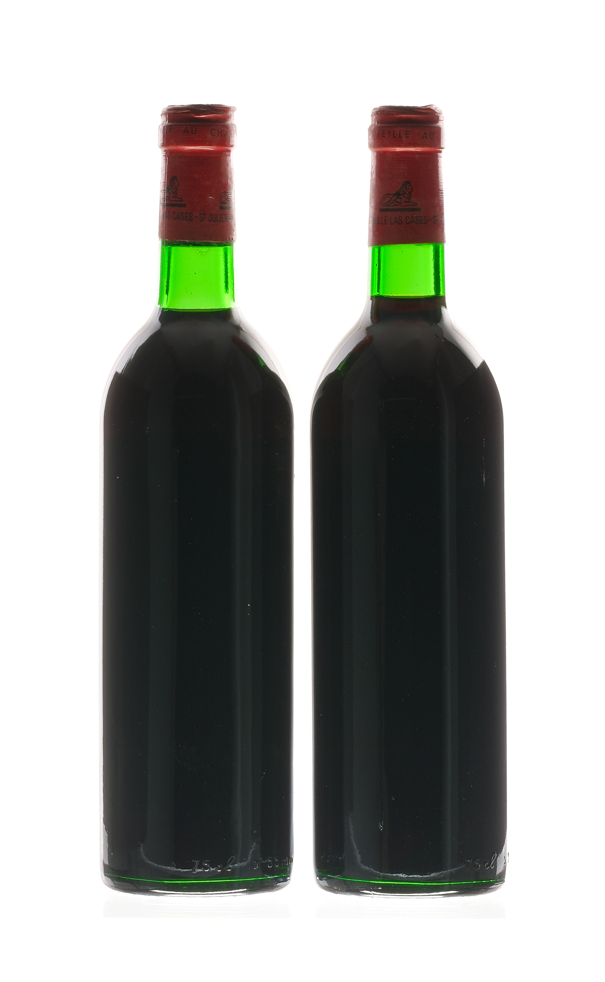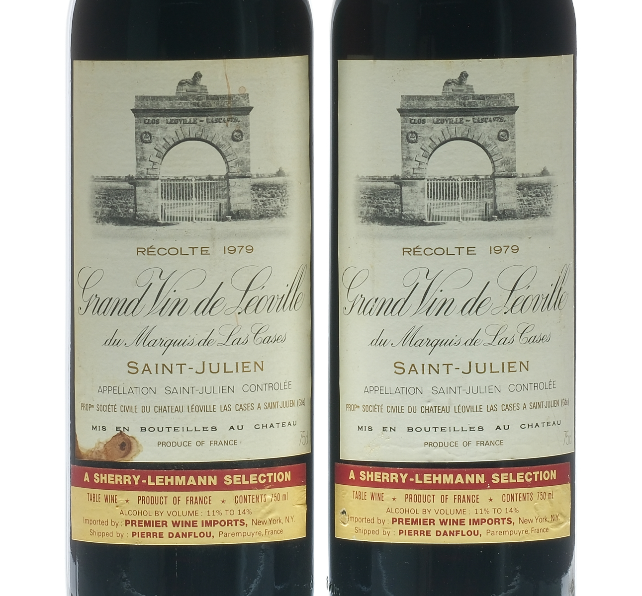 Fill Level = Base Neck/Top Shoulder. Labels good. One exhibits staining. Wine Saint-Julien Grand Vin de Leoville du Marquis de las France Saint-Julien 1979 2 750ml