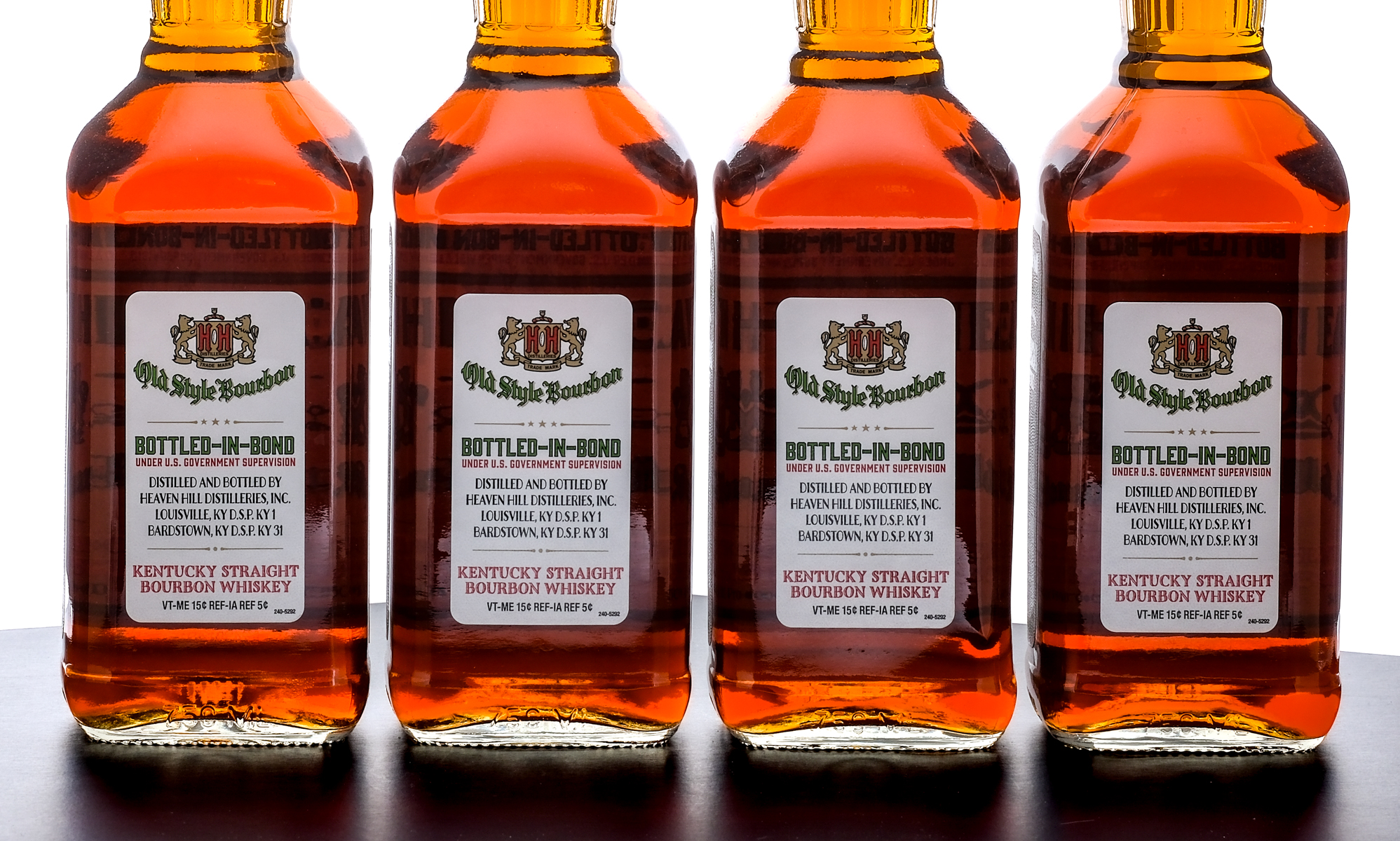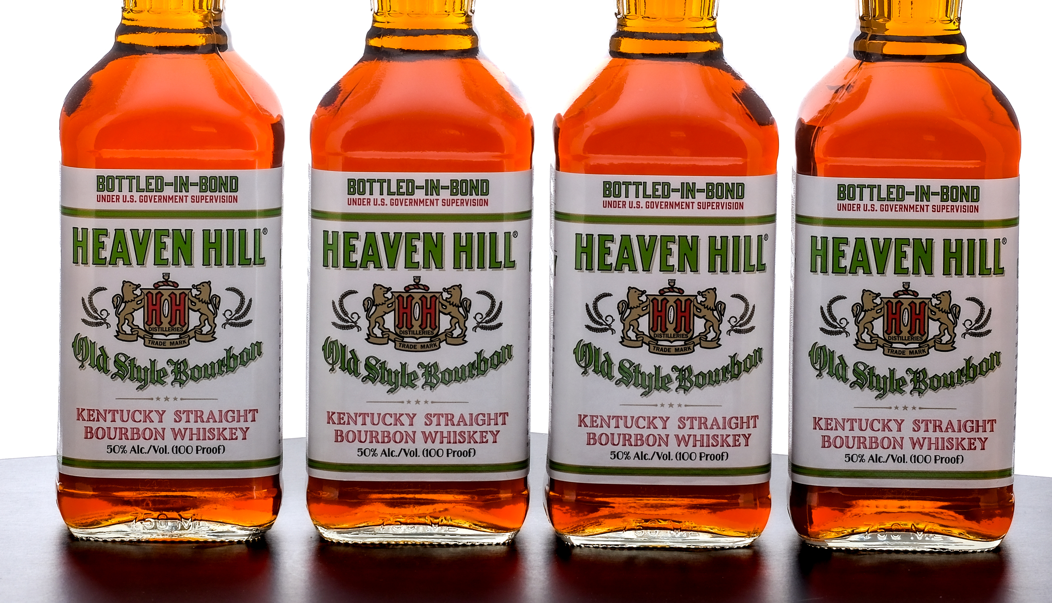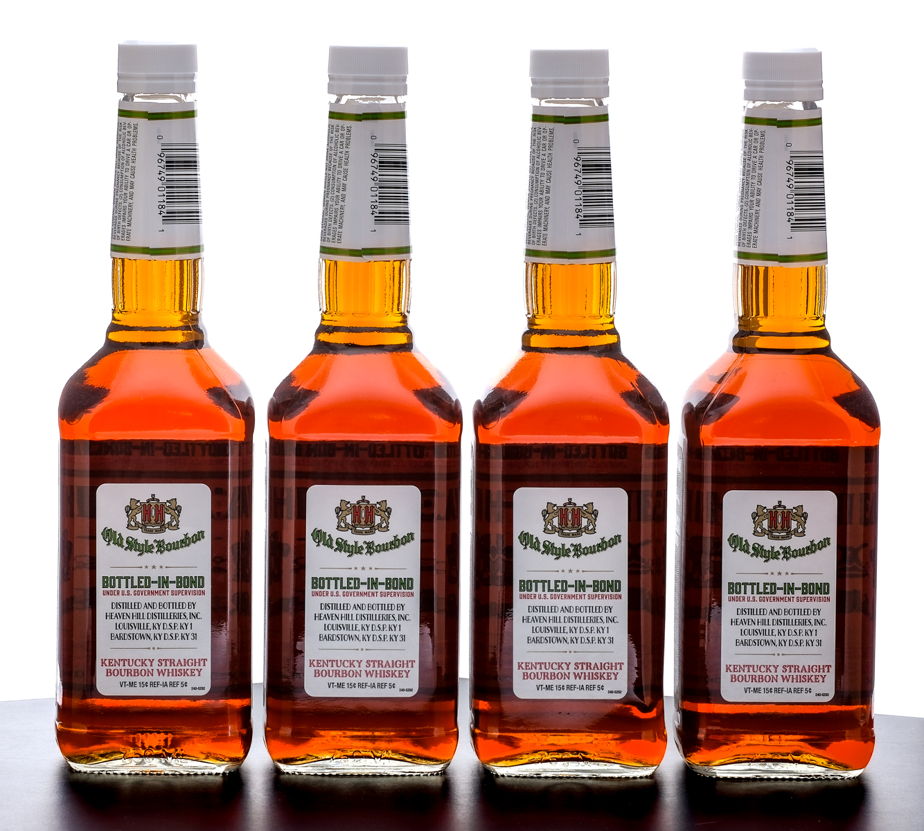 Group of four bottles of Heaven Hill 6 Year Bottled-in-Bond Old Style Kentucky Straight Bourbon Whiskey (2024). 50% ALC/VOL (100 Proof). Screw cap seals intact. Printed labels excellent. 750ml each. Distilled and bottled by Heaven Hill Distilleries.