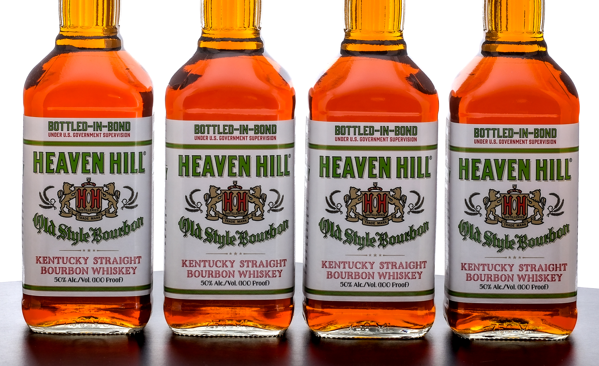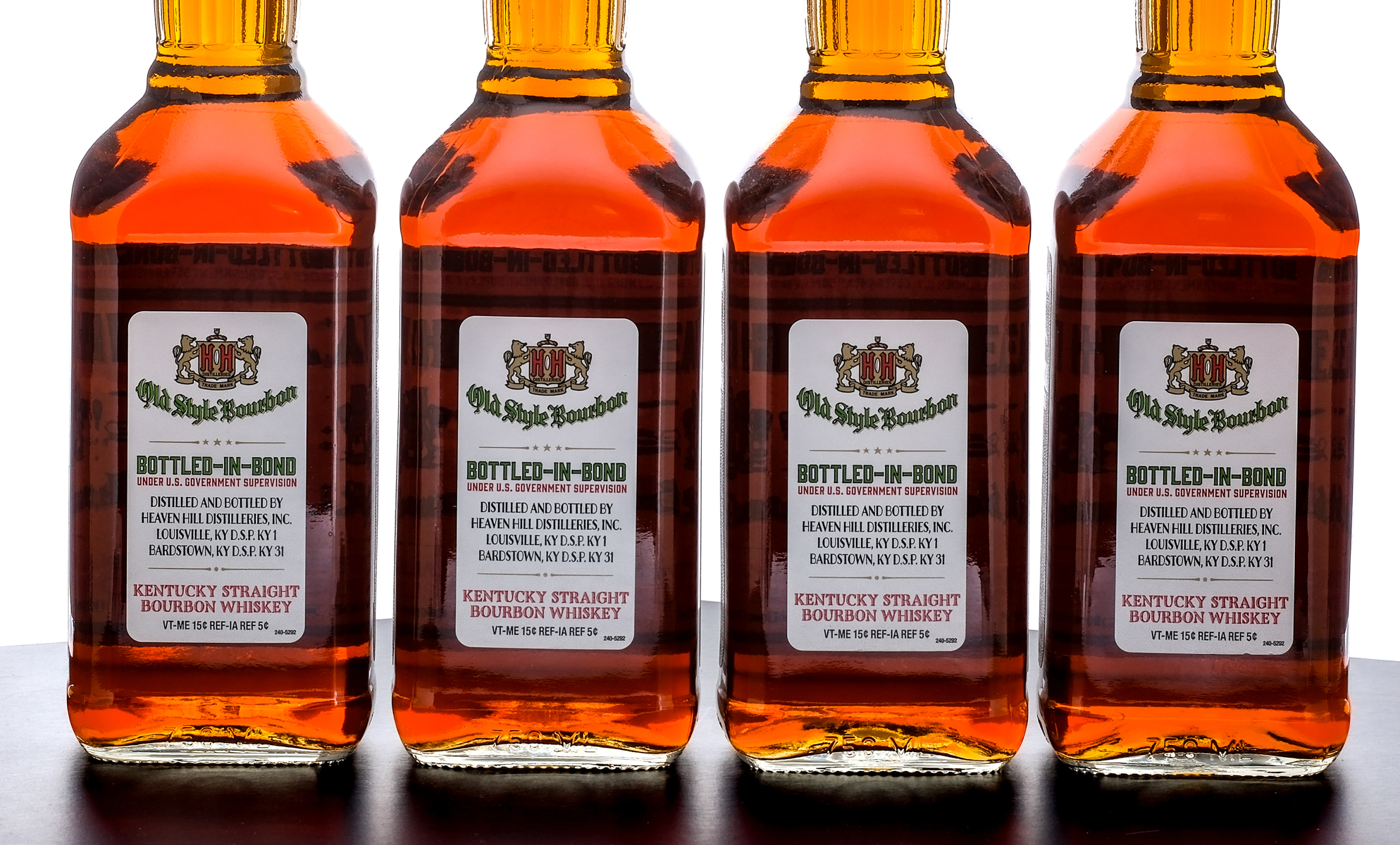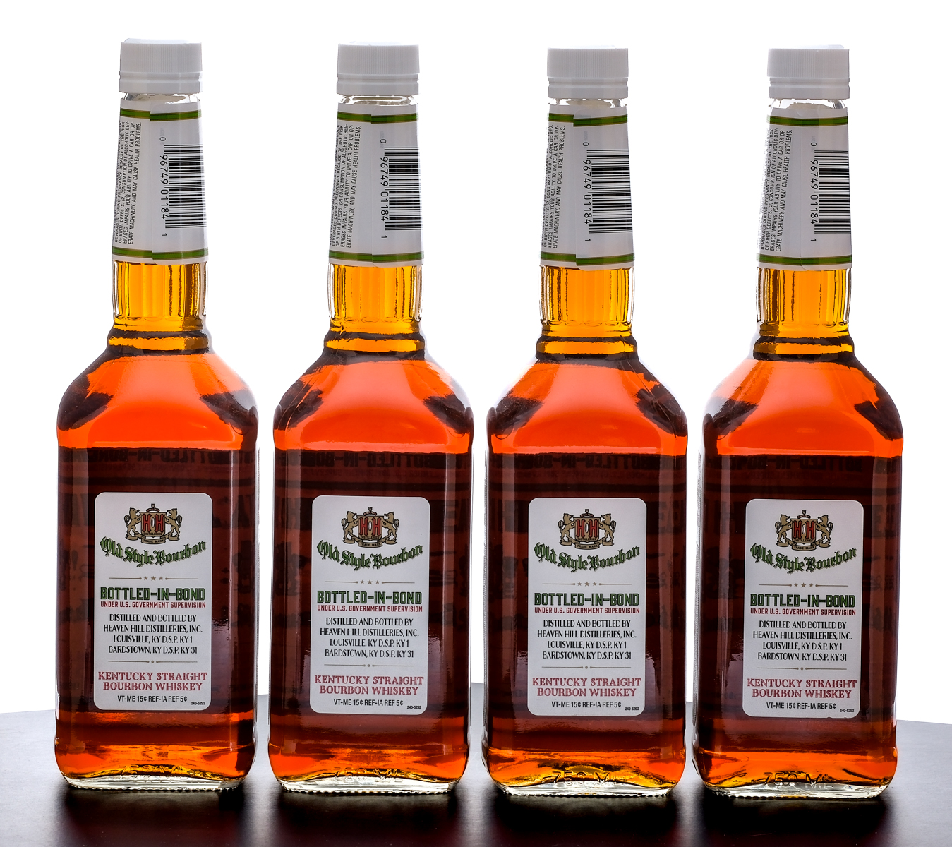Group of four bottles of Heaven Hill 6 Year Bottled-in-Bond Old Style Kentucky Straight Bourbon Whiskey (2024). 50% ALC/VOL (100 Proof). Screw cap seals intact. Printed labels excellent. 750ml each. Distilled and bottled by Heaven Hill Distilleries.