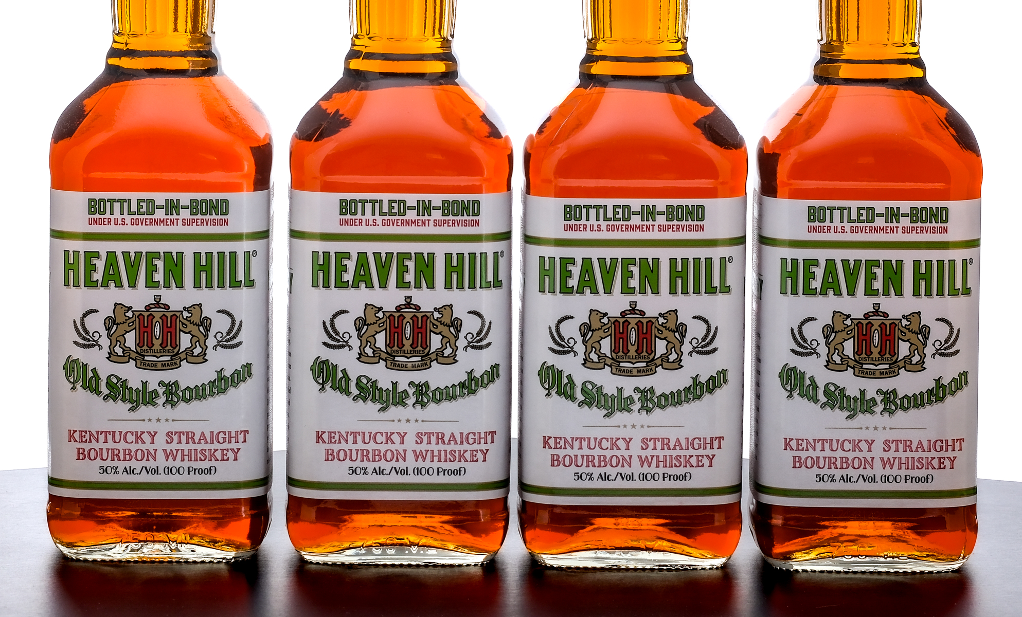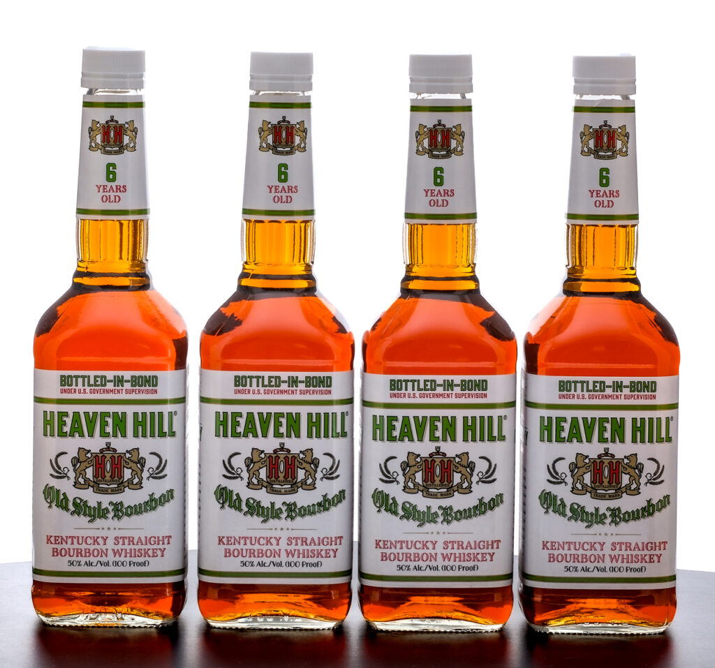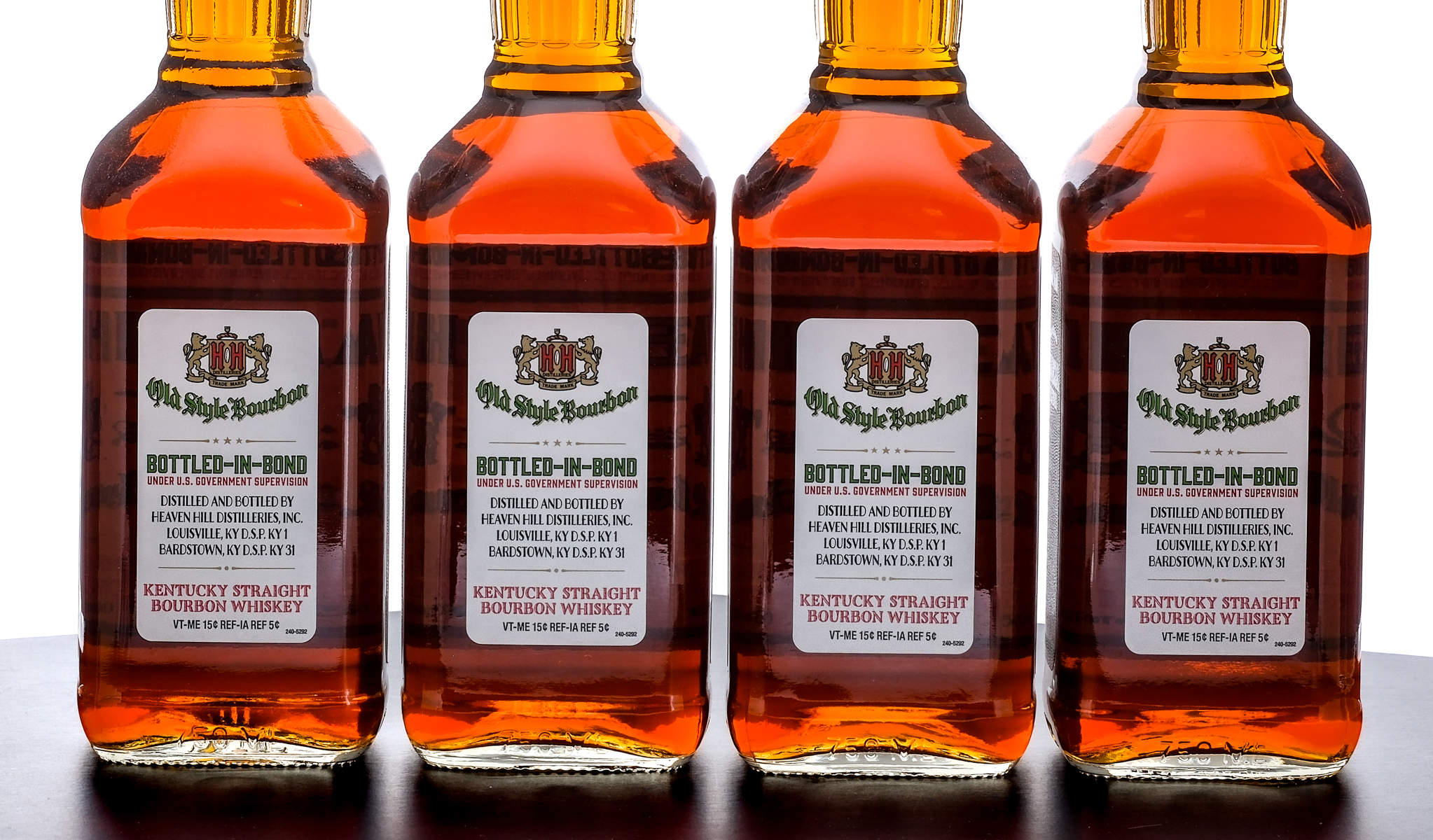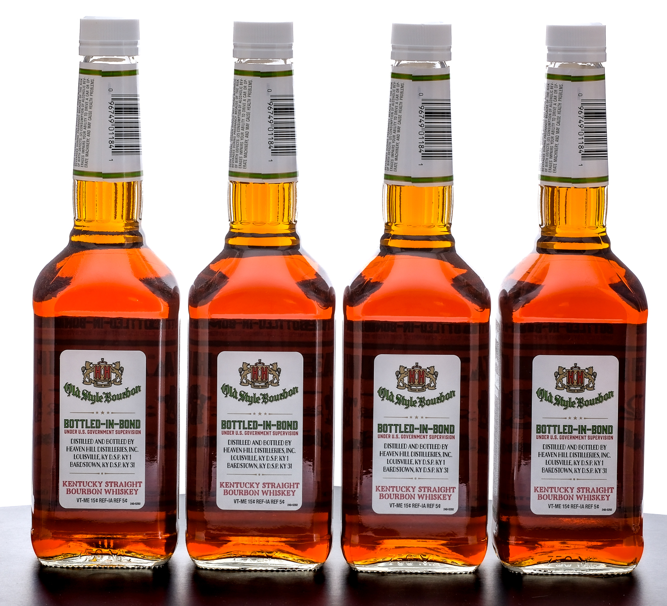 Group of four bottles of Heaven Hill 6 Year Bottled-in-Bond Old Style Kentucky Straight Bourbon Whiskey (2024). 50% ALC/VOL (100 Proof). Screw cap seals intact. Printed labels excellent. 750ml each. Distilled and bottled by Heaven Hill Distilleries.