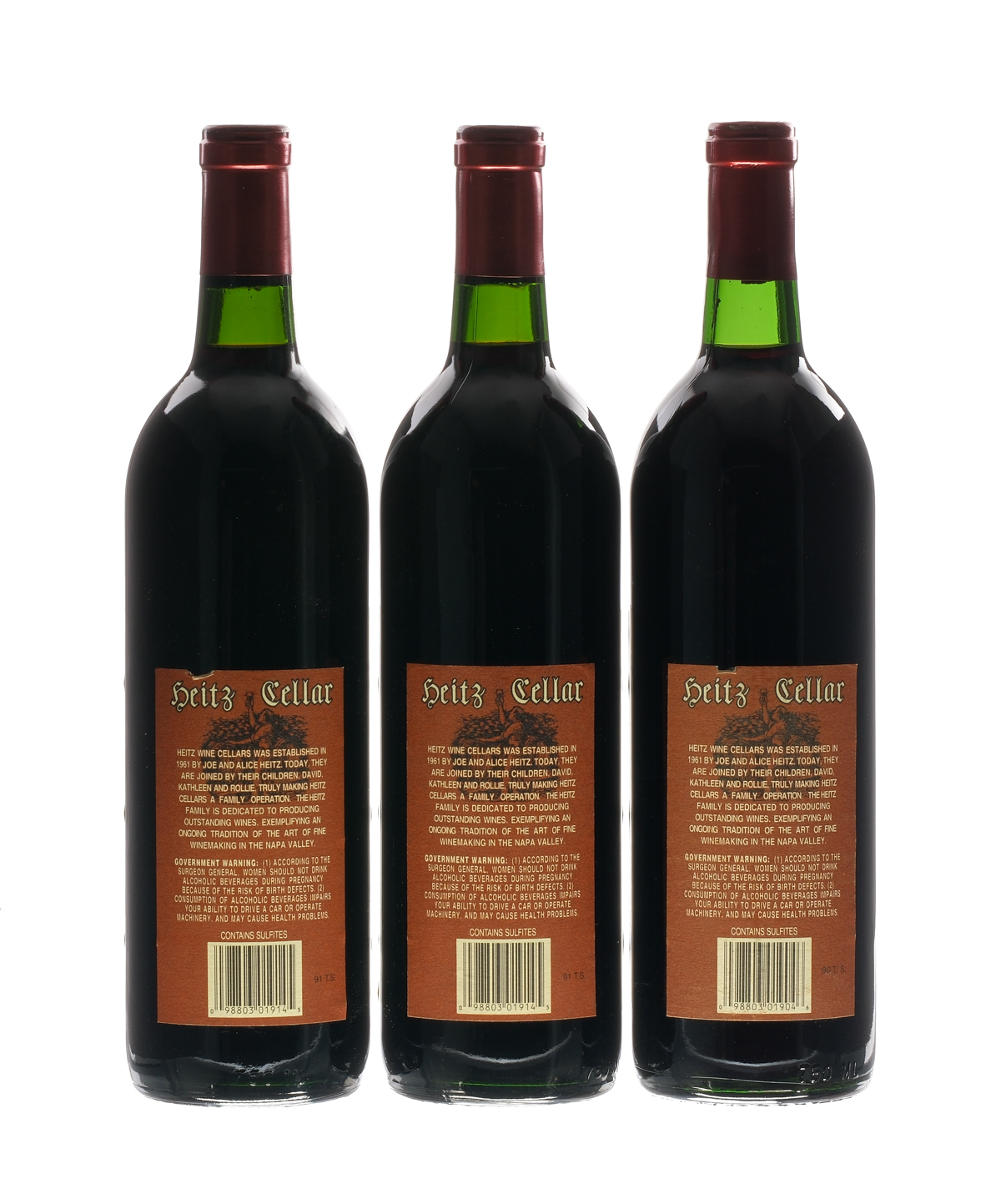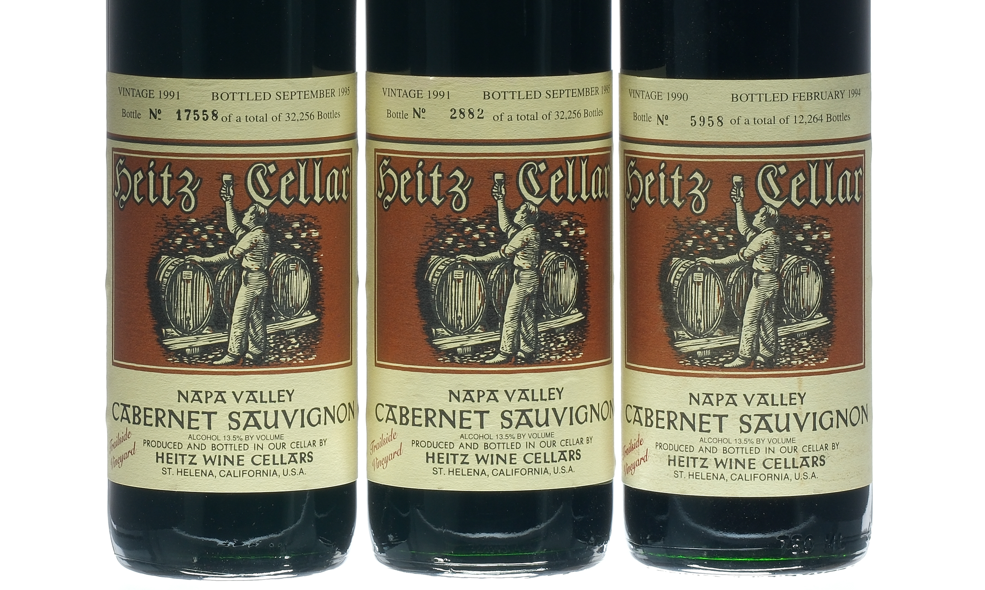 Trailside Vineyard, 1990 #5958 of 12,264/ 1991 #’s 2,882 and 17,558 of 32,256. Level on all three Base Neck. Labels excellent. Wine Heitz Wine Cellars USA Napa Valley Cabernet Sauvignon 1990, 91 x2 3 750ml