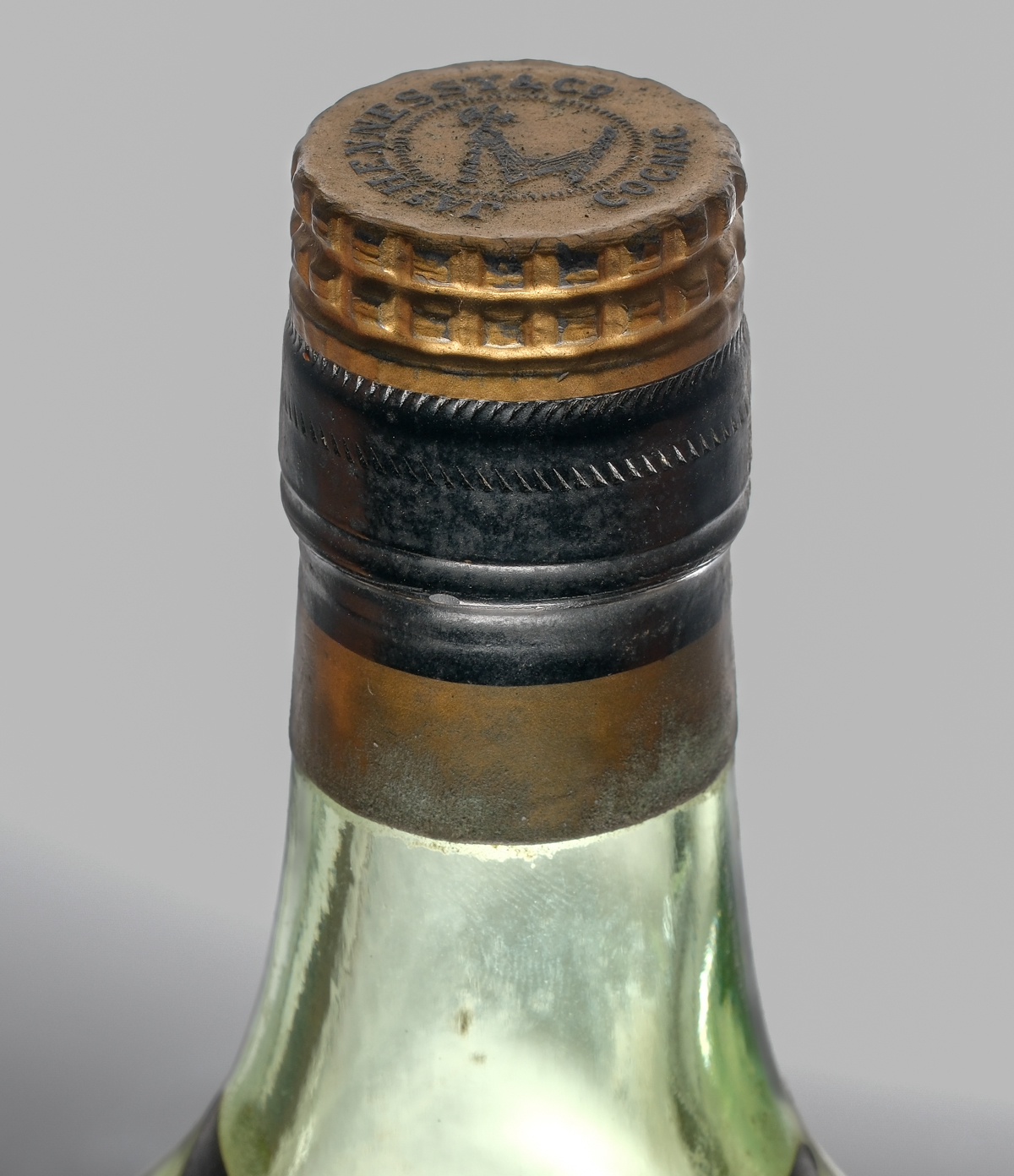 40% ALC/VOL. Foil exhibits losses but is intact. Labels are loosening but intact. Significant wear evident on black label so that print is illegible. Cognac Jas Hennessey & Co. France 1970’s 1 Est. 70cl