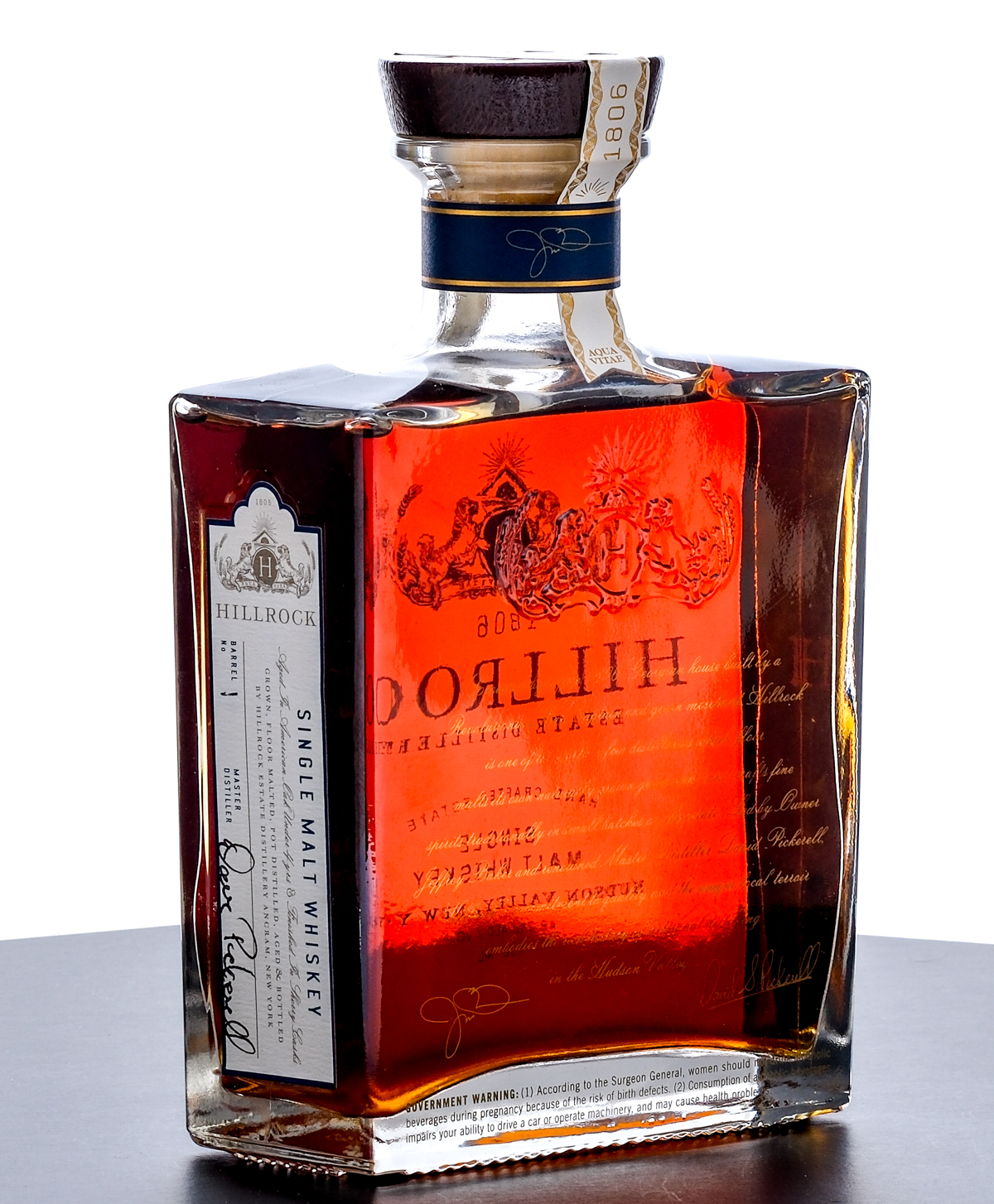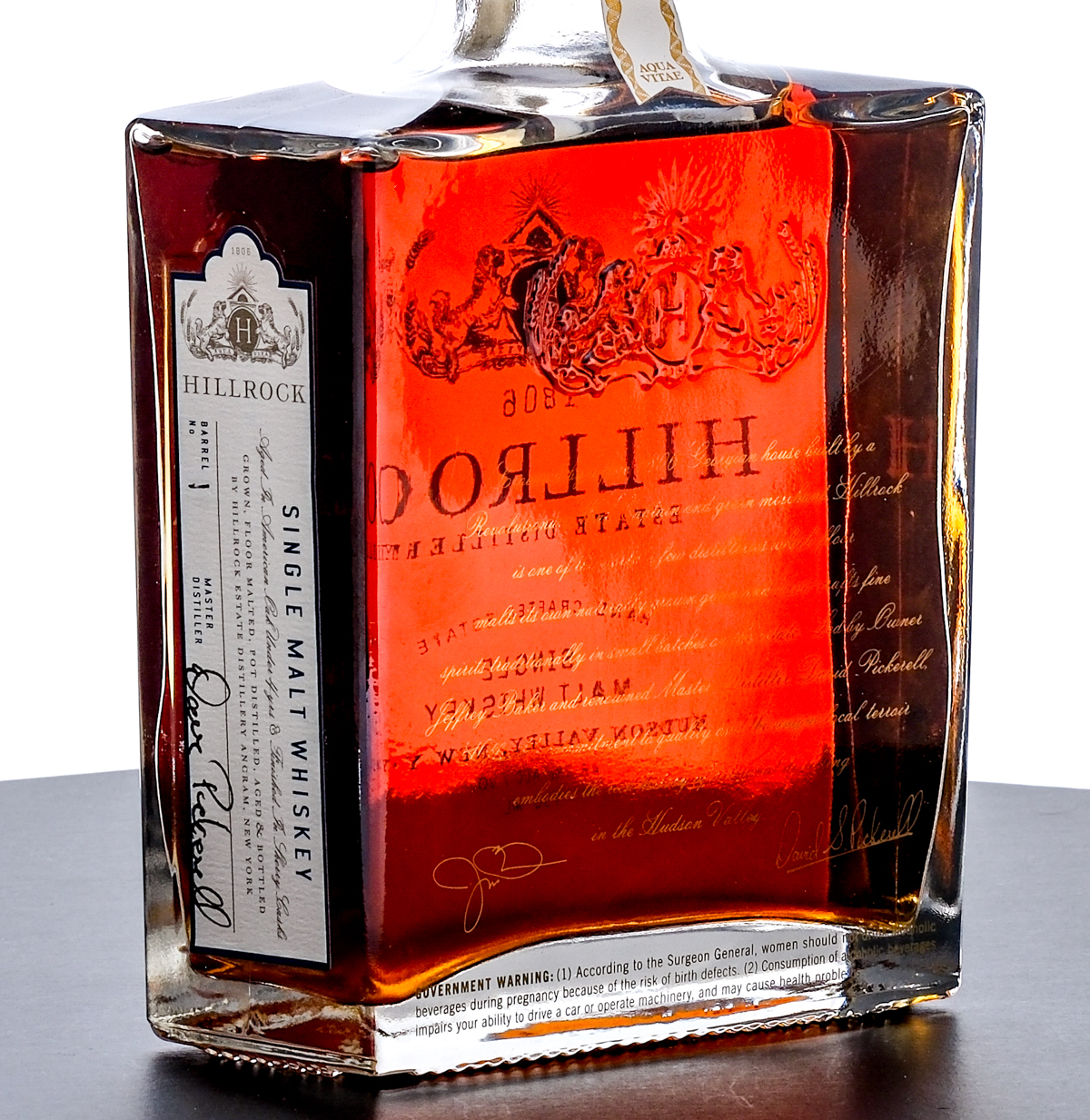 From the Collection of Michael Aronoff Hillrock Estate Distillery Hand Crafted Single Malt Whiskey. Barrel No. 1. 48.2% ALC/VOL (96.4 Proof). Stamp seal intact. Screened and printed labels excellent. 750ml. Crown, floor malted, pot distilled, aged & bottled by Hillrock Estate Distillery Ancram, New York.