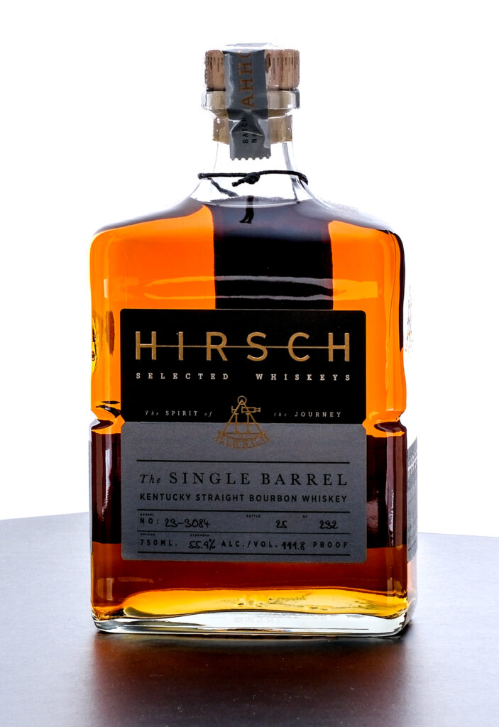 Hirsch Selected Whiskeys The Single Barrel Kentucky Straight Bourbon Whiskey. Exclusivly picked by Conti’s Wines & Spirits. Aged 6 years 4 Months. Barrel no: 23-3084. Bottle 25 of 232. Mash Bill: 72% corn, 13% rye, 15% malted barley. 55.9% ALC./VOL. 111.8 Proof. Plastic and stamp seal intact. Hang tag intact. Printed labels in excellent condition. 750ml. Distilled in Lawrenceburg, IN. Botted by Hirsch in Bardstown, KY.
