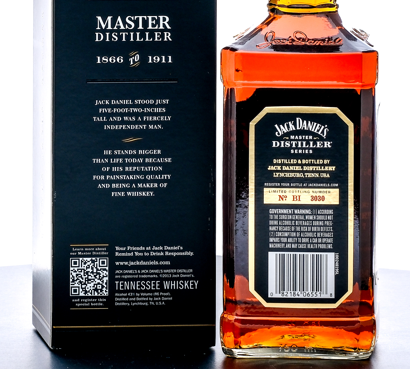 Commemorating Jasper Newton “Jack” Daniel’s tenure as Master Distiller from 1866 to 1911. Limited Edition. Limited bottling number: BI 3030. 43% ALC/VOL (86 Proof). Cardboard box excellent. Foil excellent. Labels on bottle very good, some small tears are present along their edges. 750ml. Jack Daniel Distillery.
