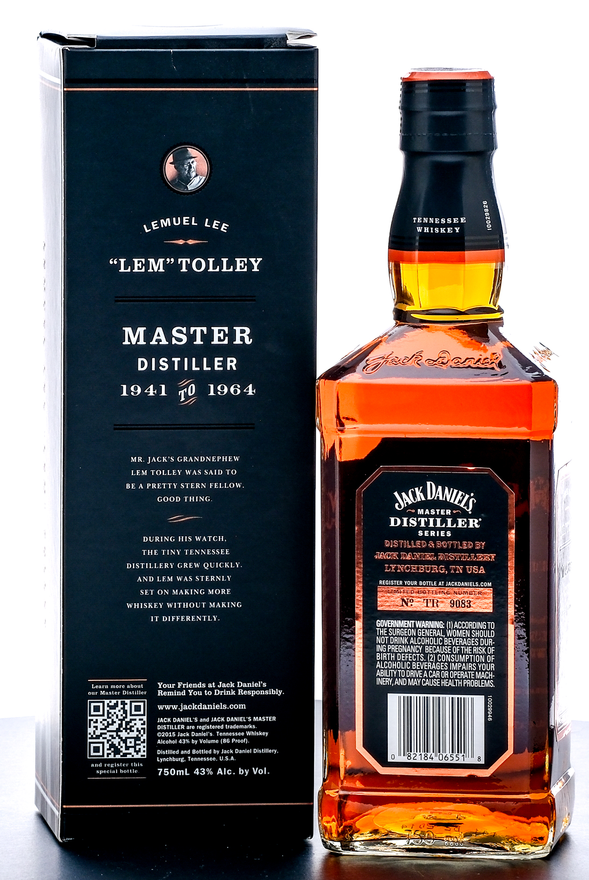 Commemorating Lemuel Lee “Lem” Tolley’s tenure as Master Distiller from 1941 to 1964. Limited Edition. Limited bottling number: TR 9083. 43% ALC/VOL (86 Proof). Cardboard box very good (minor scratch in the front, minor crease at the top of back of box). Foil excellent. Labels on bottle good (some small tears present along their edges). 750ml. Jack Daniel Distillery.