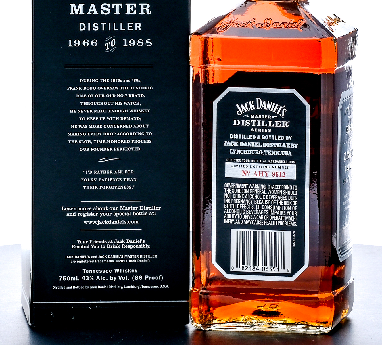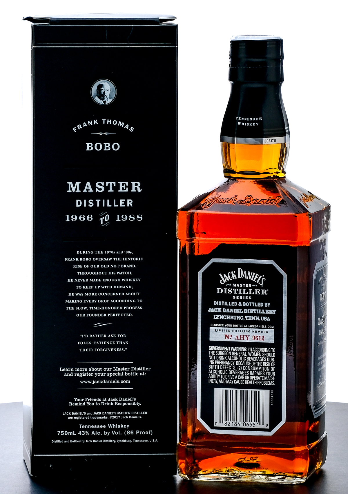 Jack Daniel’s Limited Edition Tennessee Whiskey (2016). Master Distiller Series “Frank Thomas Bobo” No. 5. Bottling No. AHY 9612. 43% ALC/VOL (86 Proof). Foil seal excellent. Printed labels very good (minor tears on front and side of the label). Original box very good with some slight loss exposing the silver foil around the box.) 750ml. Distilled & Bottled by Jack Daniel Distillery.