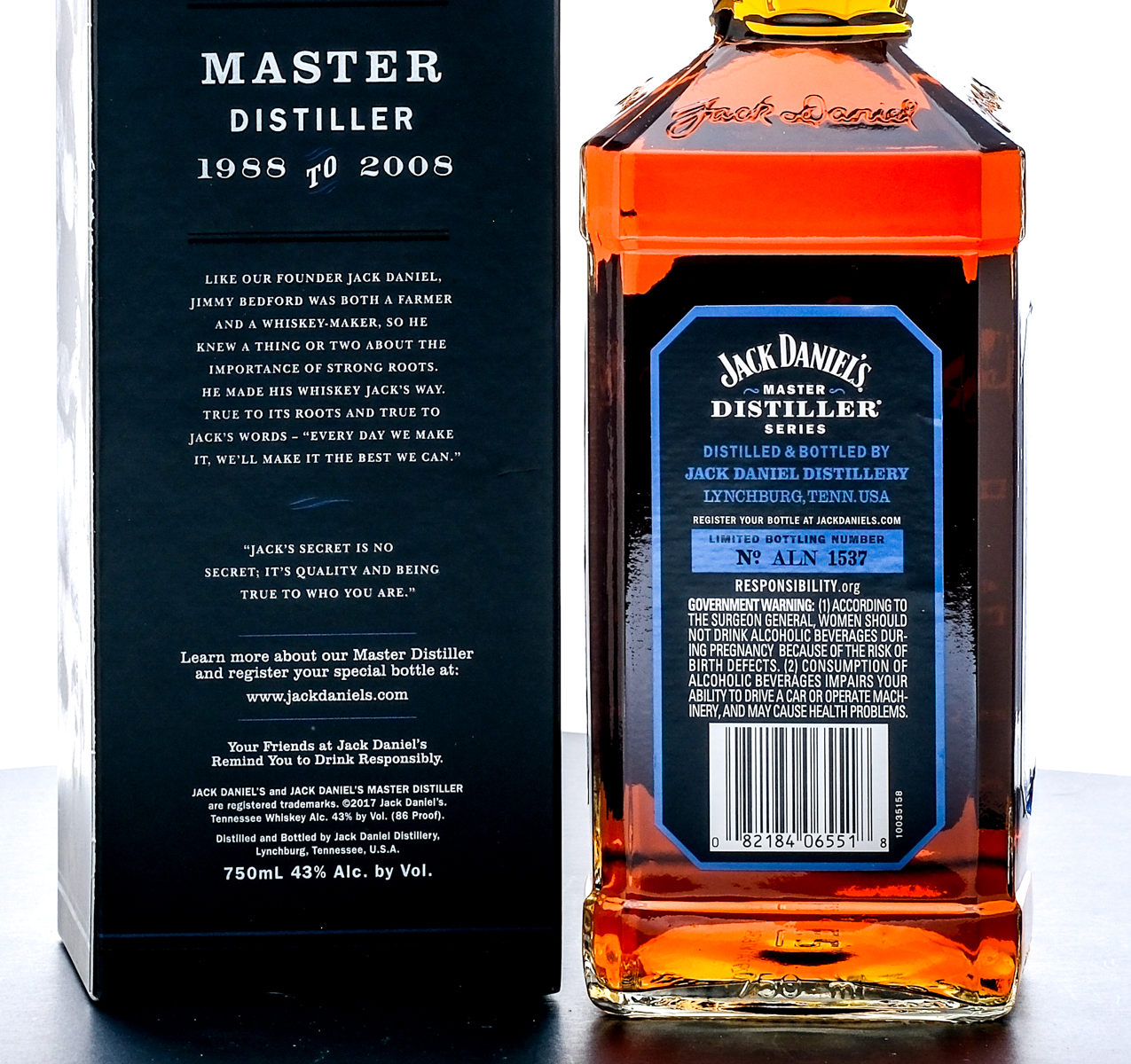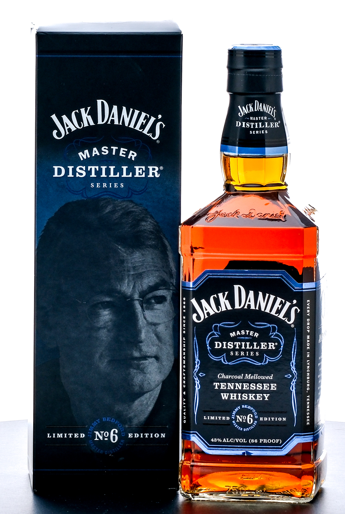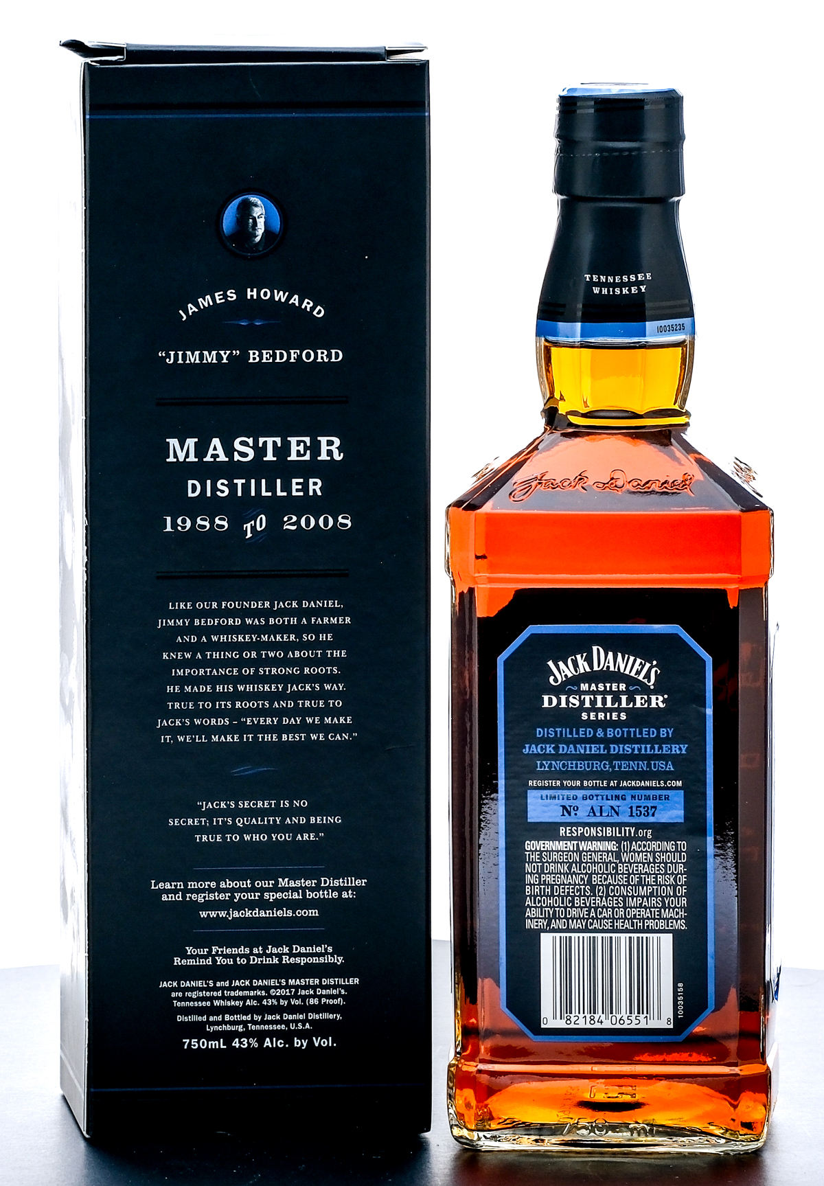 Jack Daniel’s Limited Edition Tennessee Whiskey (2017). Master Distiller Series “James Howard “Jimmy” Bedford” No. 6. Bottling No. ALN 1587. 43% ALC/VOL (86 Proof). Foil seal excellent. Printed labels fair with one big tear on left side of label with minor tears on front and right side. Original box very good (some shelf wear and loss throughout exposing the silver foil of the box.) 750ml. Distilled & Bottled by Jack Daniel Distillery.