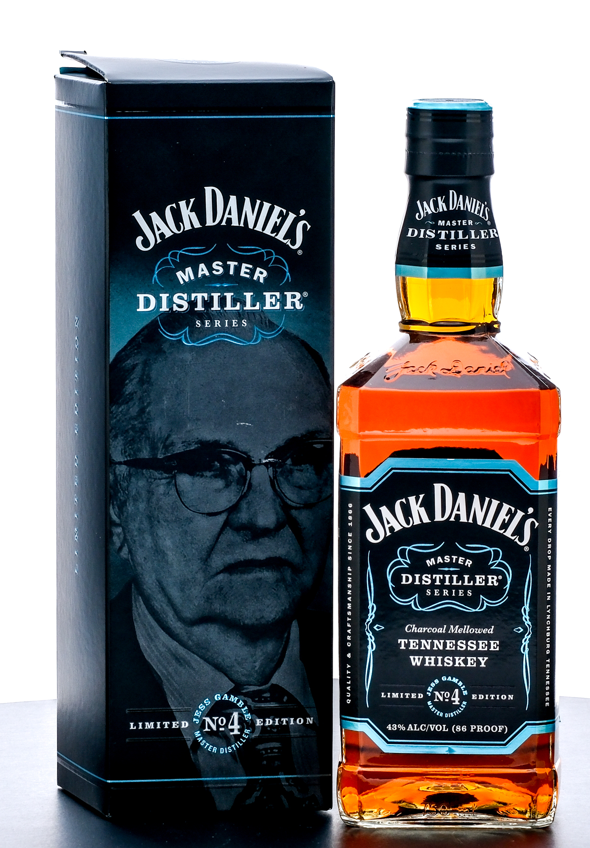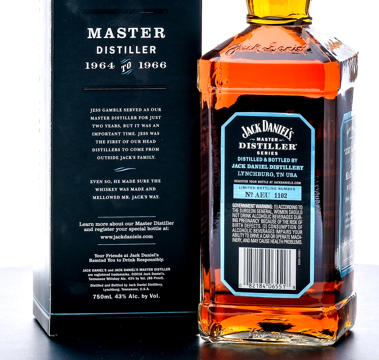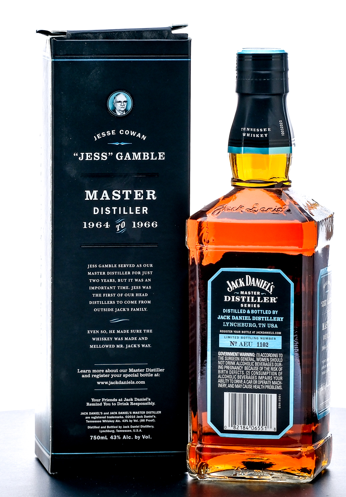 Jack Daniel’s Limited Edition Tennessee Whiskey (1964-1966). Master Distiller Series Jesse Cowan “Jess” Gamble No. 4. Bottling No. AEU 1102. 43% ALC/VOL (86 Proof). Foil seal excellent. Printed labels very good (some small tears are present). Original box very good (Some loss and scratches in the front and a small crease on the side flap). 750ml. Distilled & Bottled by Jack Daniel Distillery.