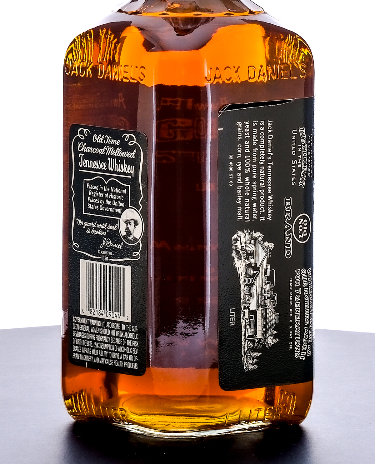 Jack Daniel’s Vintage Sour Mash Tennessee Whiskey Circa 1985-2002 (markings on the bottom of the bottle embossed 93 and etched 96) . Old No. 7 Brand. 43% ALC/VOL (86 Proof). Plastic seal intact. Printed labels in good condition with some dings on the top center of front label. 1 liter. Distilled and Bottled by Jack Daniel Distillery.