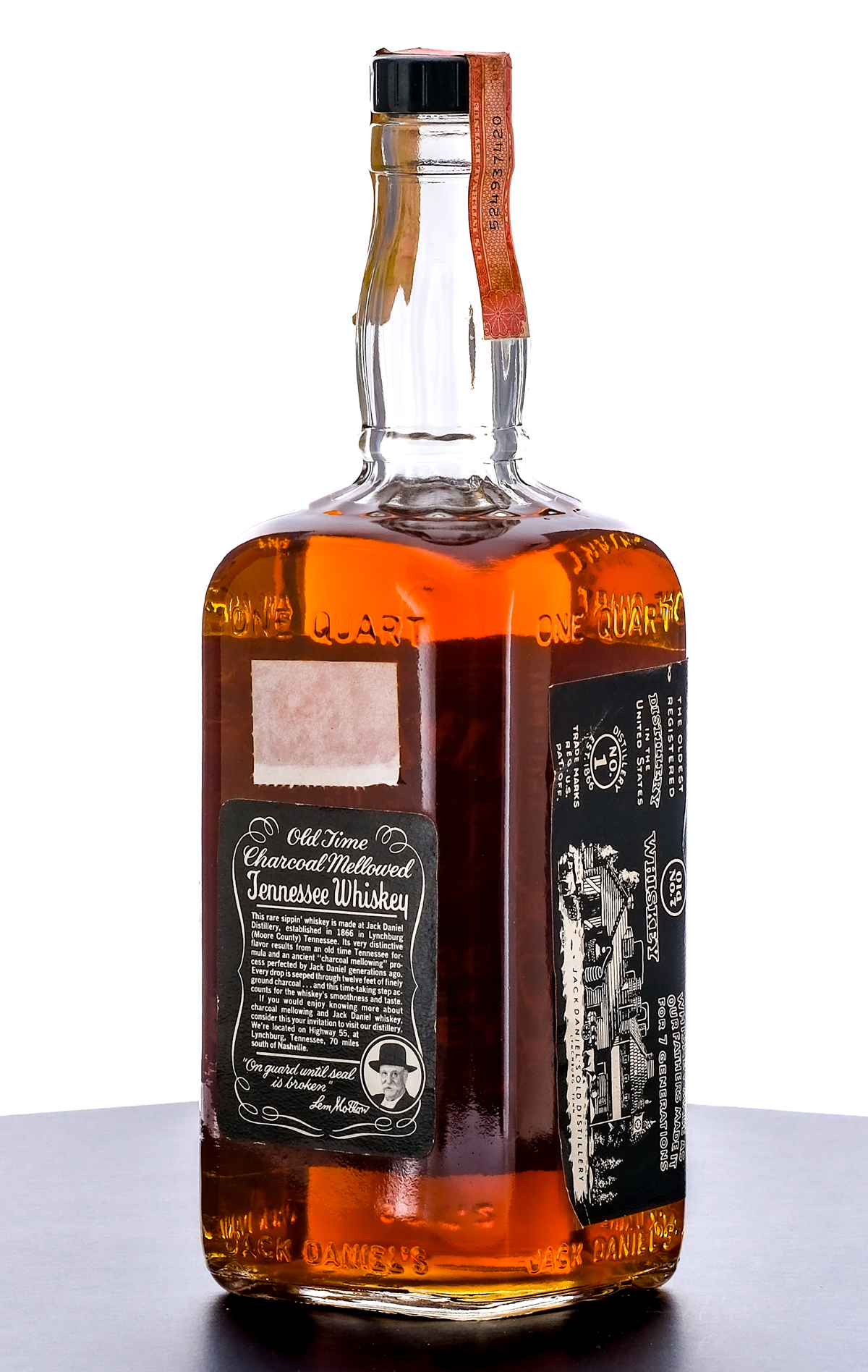 Jack Daniel’s Old No. 7 Brand Tennessee Sour Mash Whiskey. Circa 1961-1977 (possibly 1973?). 90 Proof. Stamp seal intact (with some discoloration and staining). Printed labels in good condition with some lifting at the lower left corner of front label. 1 Quart. Distilled and bottled by Jack Daniel Distillery.