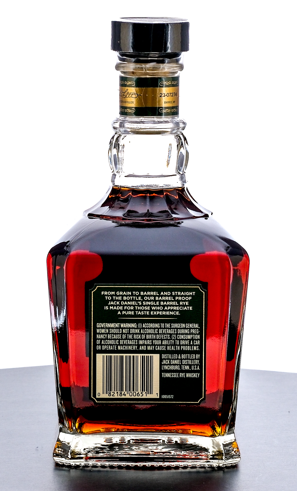 Jack Daniel’s Single Barrel Barrel Proof Tennessee Rye Whiskey. Barrel House: 2-18. Barrel No. 23-07274. Bottling Date: 8.16.23. 64.50% ALC/VOL (129.0 Proof). Plastic seal intact. Printed labels excellent. 750ml. Distilled & bottled by Jack Daniel Distillery.