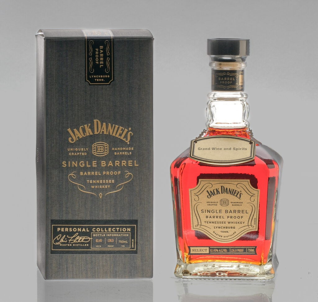 Grand Wine and Spirits barrel pick, front label list Master Distiller Chris Fletcher Personal Collection. Barrel Proof. Select. Barrel House 2-24. Barrel No. 23-23023. Dump date: 5.15.23. 63.45% ALC/VOL. 126.9 Proof. Original carboard box excellent. Hang tag and chain intact. Plastic seal intact. Whiskey Tennessee Jack Daniel USA Tennessee 2023 1 750ml