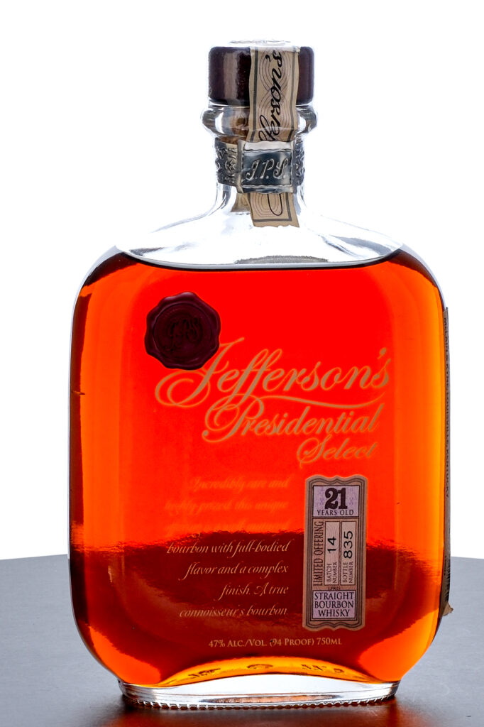 From The Collection of Michael Aronoff: Jefferson’s Presidential Select 21 Year Old Kentucky Straight Bourbon Whiskey (2013). Limited Offering. Batch Number 14. Bottle Number 835. 47% ALC/VOL (94 Proof). Plastic seal intact. Stamp seal intact. Paper seal intact (but exhibits minor lifting at one end). Wax medallion intact. Printed label good (Exhibits lifting and tearing at one end). Screened label excellent. 750ml. Bottled by McLain & Kyne.
