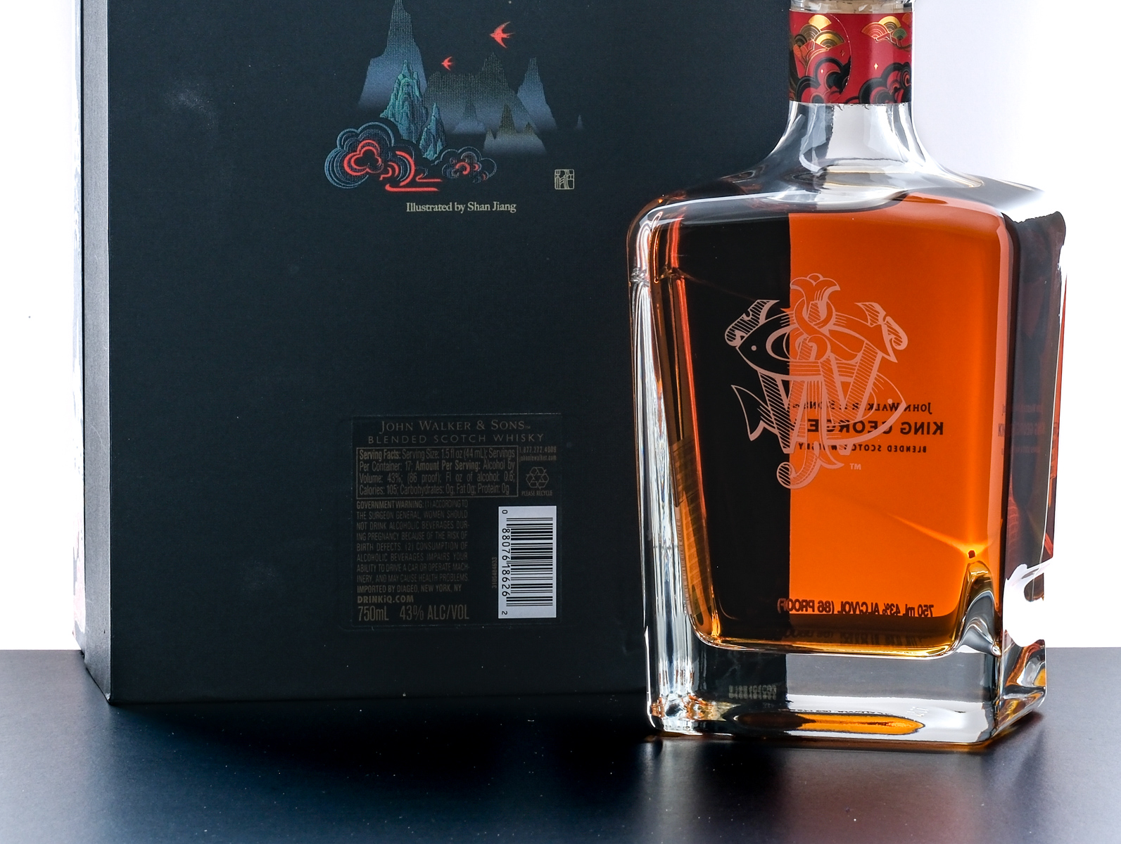 John Walker & Sons King George V Blended Scotch Whisky Limited Edition Design Illustrated by Shan Jiang, 43% ALC/VOL 750ML. Created to celebrate John Walker & Sons being granted its first Royal Warrant in 1934 by King George V, with hand-selected whiskies from distilleries that existed during his reign. As a result this elegant blend is made with some of the rarest reserves, including irreplaceable casks from the now-closed Port Ellen distillery. Bottle, Seal, and packaging, very good.