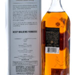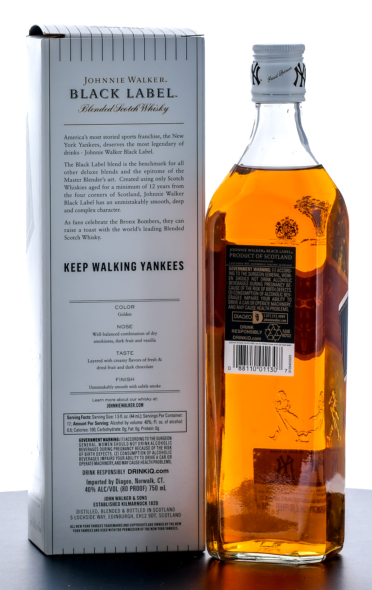 Johnnie Walker Black Label 12 Year Blended Scotch Whiskey New York Yankees Limited Edition (2018). 40% ALC/VOL (80 Proof). This bottle’s cardboard domicile is very good with some minor adhesive residue on lid. Screw top on bottle intact. Printed labels excellent. 750ml. Distilled, Blended & Bottled in Scotland by John Walker & Sons. Imported by Diageo (Norwalk, CT).