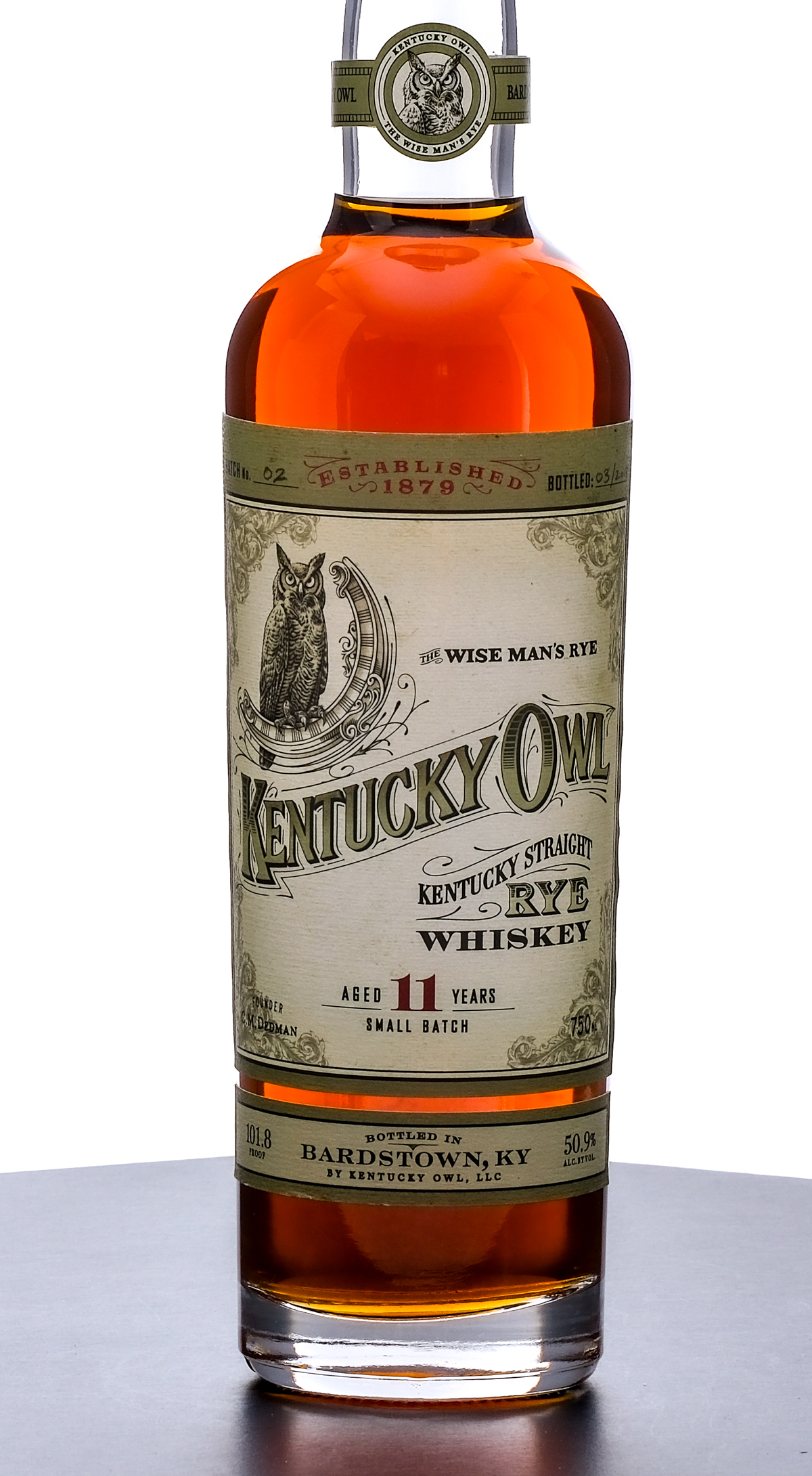 Kentucky Owl 11 Year Kentucky Straight Rye Whiskey Small Batch (2018). Batch No. 02. Bottled 03/20218. 50.9% ALC/VOL (101.8 Proof). Plastic seal excellent. Printed labels excellent. 750ml. Bottled in Bardstown KY. by Kentucky Owl, LLC.
