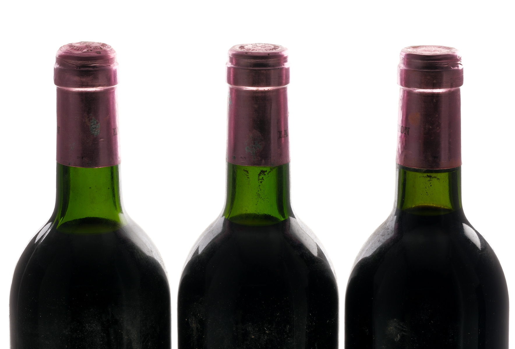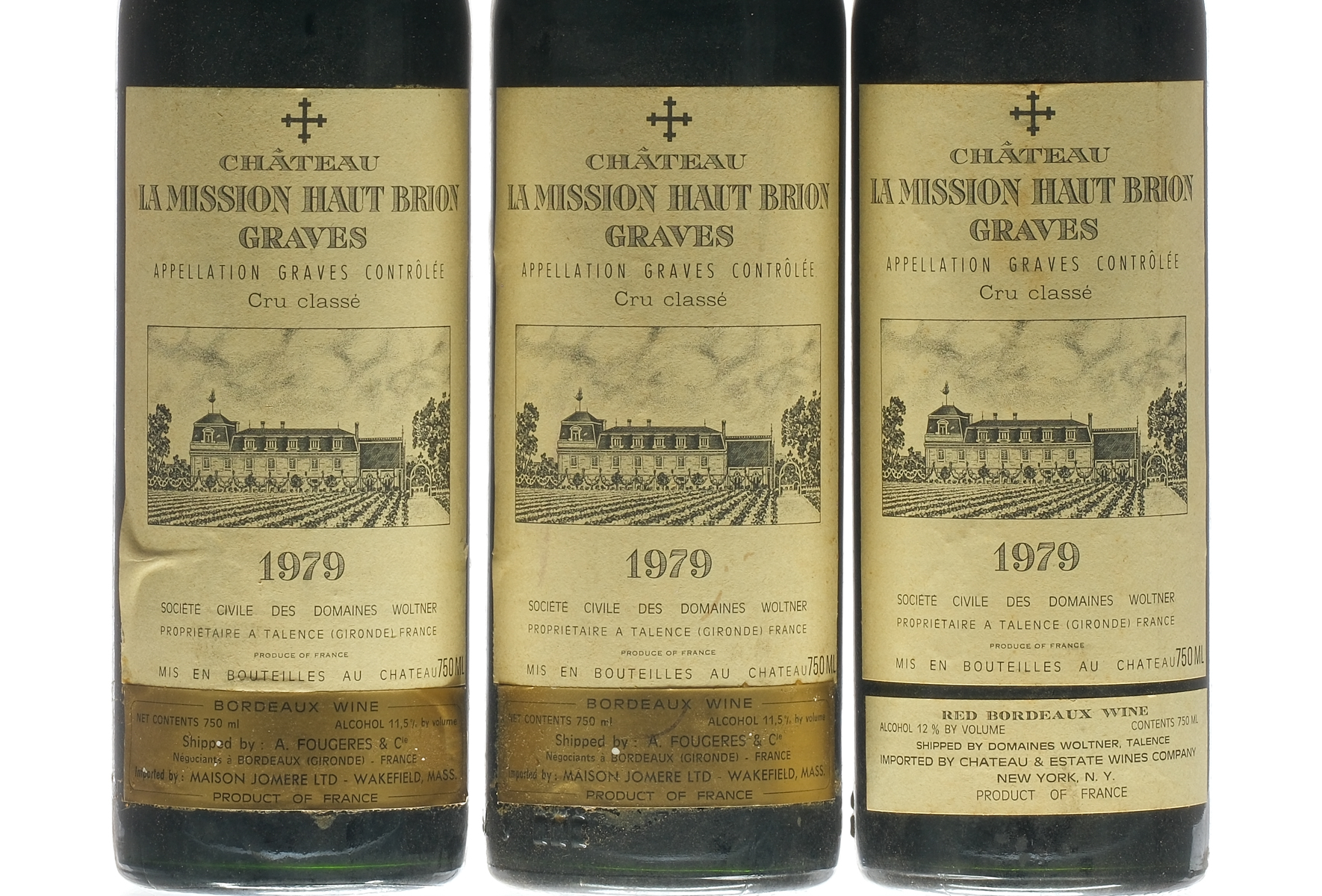 Cru classe. Two bottles imported by Maison Jomere Ltd. (Wakefield, MA) and one imported by Cheateau & Estate Wines Company (NY, NY). Cork raised on one bottle. Fill Level = Base Neck. Labels good to excellent. Contents not guaranteed. Wine Bordeaux Chateau La Mission Haut-Brion Graves France Bordeaux 1979 3 750ml