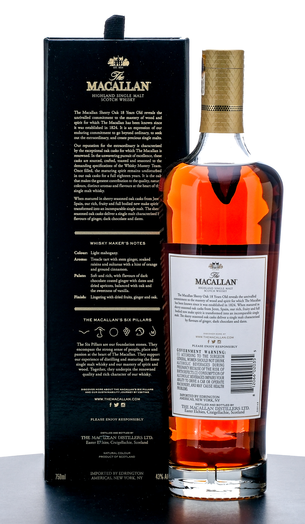 The Macallan 18 Year Sherry Oak Cask Highland Single Malt Scotch Whisky. Annual 2023 Release. Matured in exceptional Sherry seasoned Oak casks from Jerez, Spain. 43% ALC/VOL. Cardboard presentation box excellent (housed within shipping box). Foil seal and printed labels on bottle likewise excellent. 750ml. Distilled and bottled by The Macallan Distillers, Ltd. Imported by Edrington Americas (New York, NY).