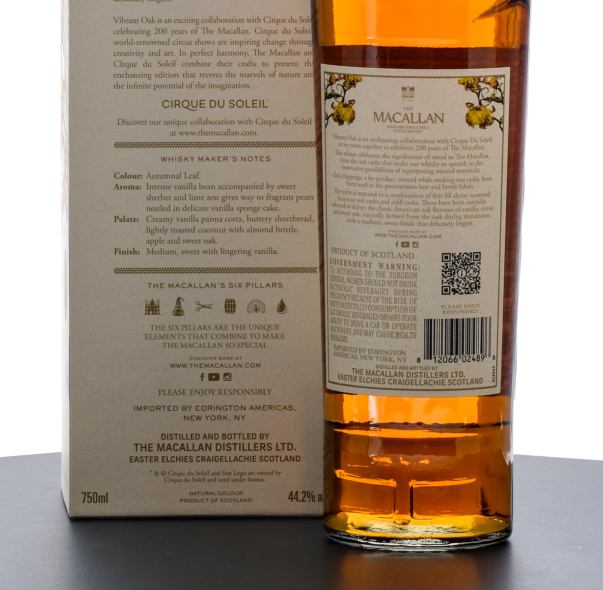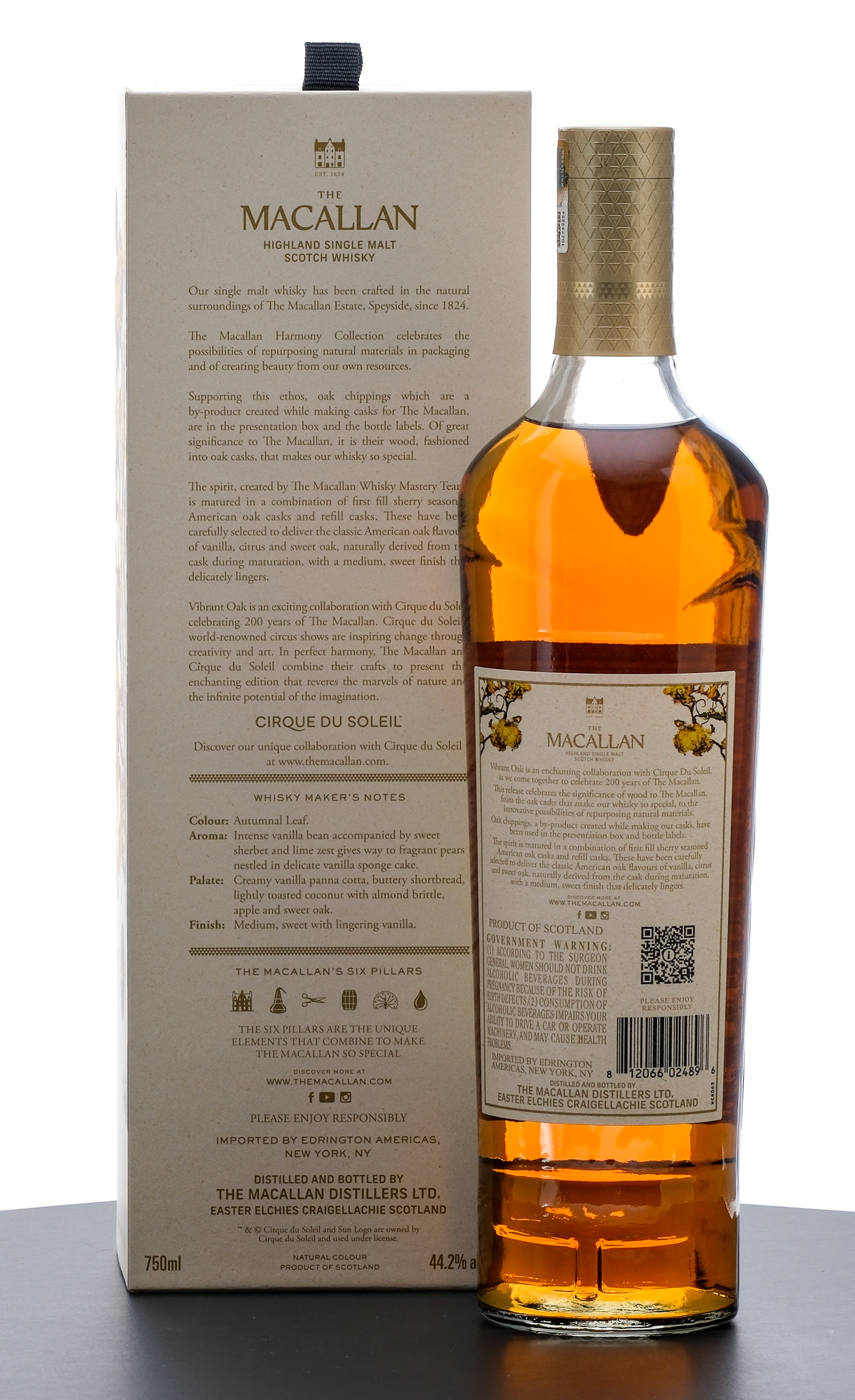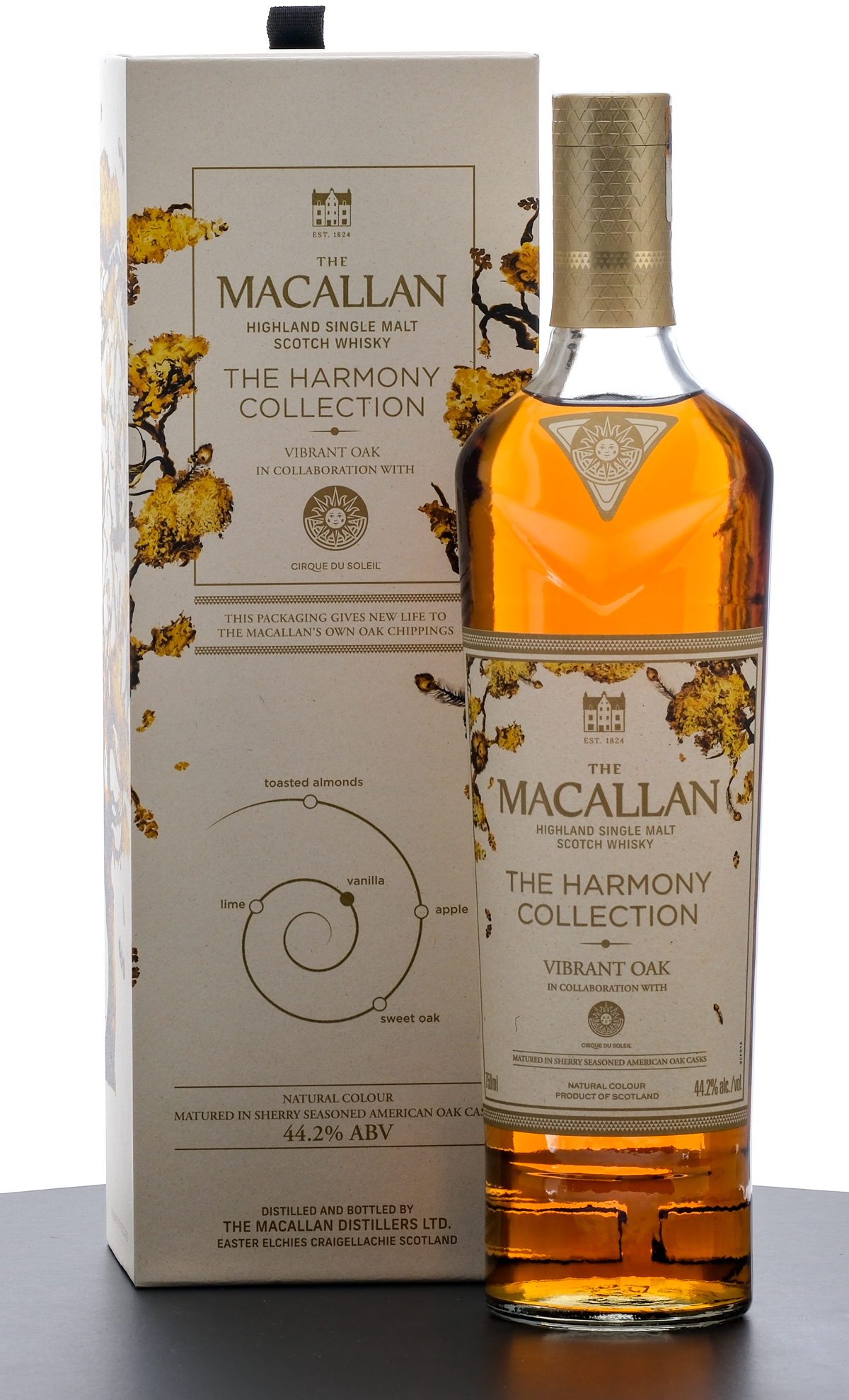 The Macallan The Harmony Collection “Vibrant Oak” Highland Single Malt Scotch Whisky. Celebrating 200 years of The Macallan in collaboration with Cirque du Soleil. 44.2% ALC/VOL. Cardboard presentation box excellent (housed within cardboard shopping box). Foil/stamp seal and printed labels on bottle excellent. 750ml. Distilled and bottled by The Macallan Distillers. Imported by Edrington Americas (New York, NY).