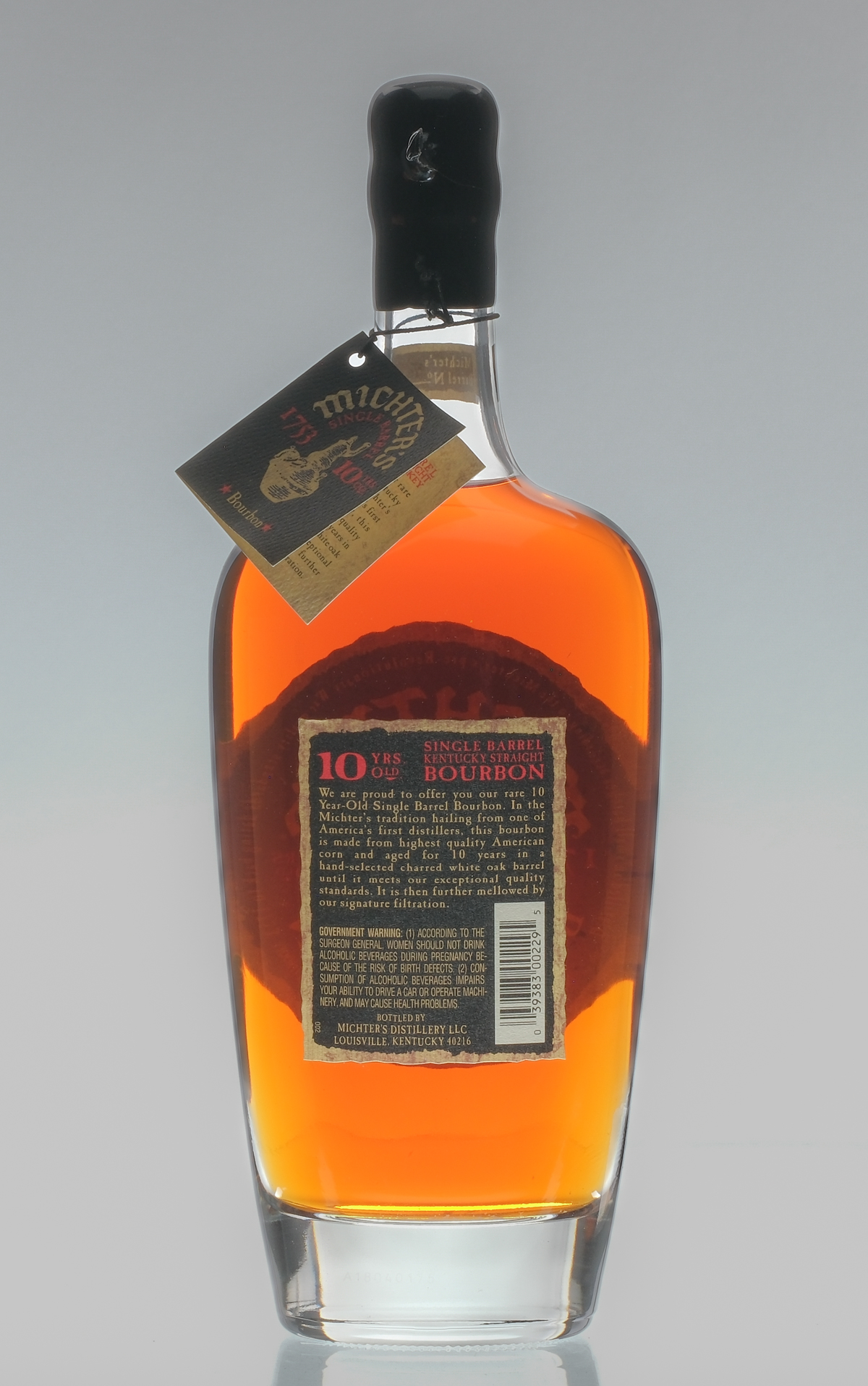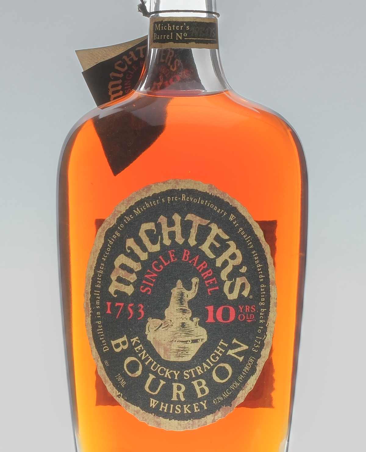 Michter’s Barrel No. 18B175. 47.2% ALC/VOL (94.4 Proof). Hang tag intact. Wax seal intact. Labels excellent. Protective mesh webbing around glass bottle. Whiskey Bourbon Michter’s Distillery USA Kentucky 2018 10 Years Old 1 750ml