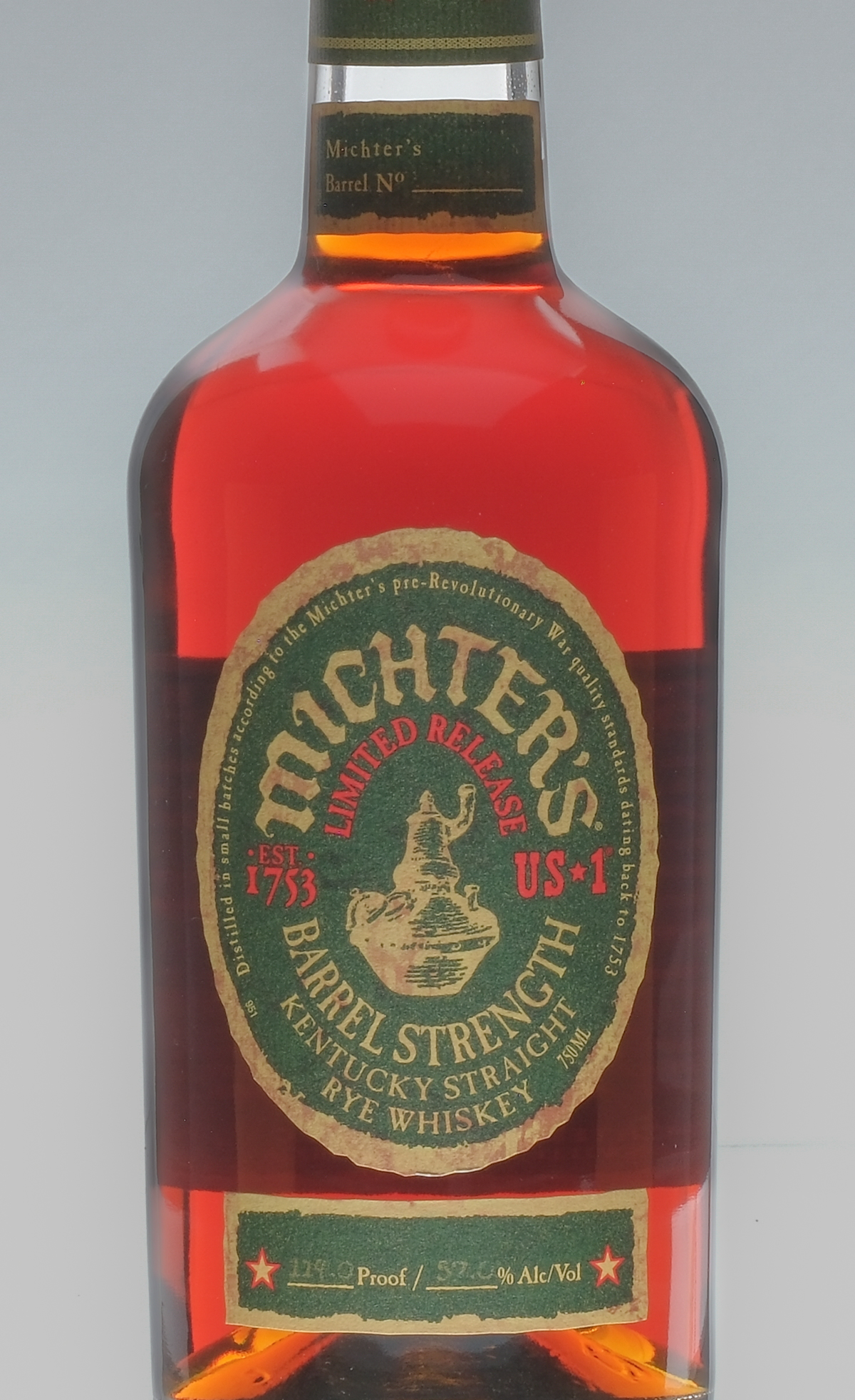 Limited Release. Barrel Strength. Michter’s Barrel No: 22B284. 114 Proof. 57% ALC/VOL. Seals intact. Labels excellent. Whiskey Rye Michter’s Distillery USA Kentucky 2022 1 750ml