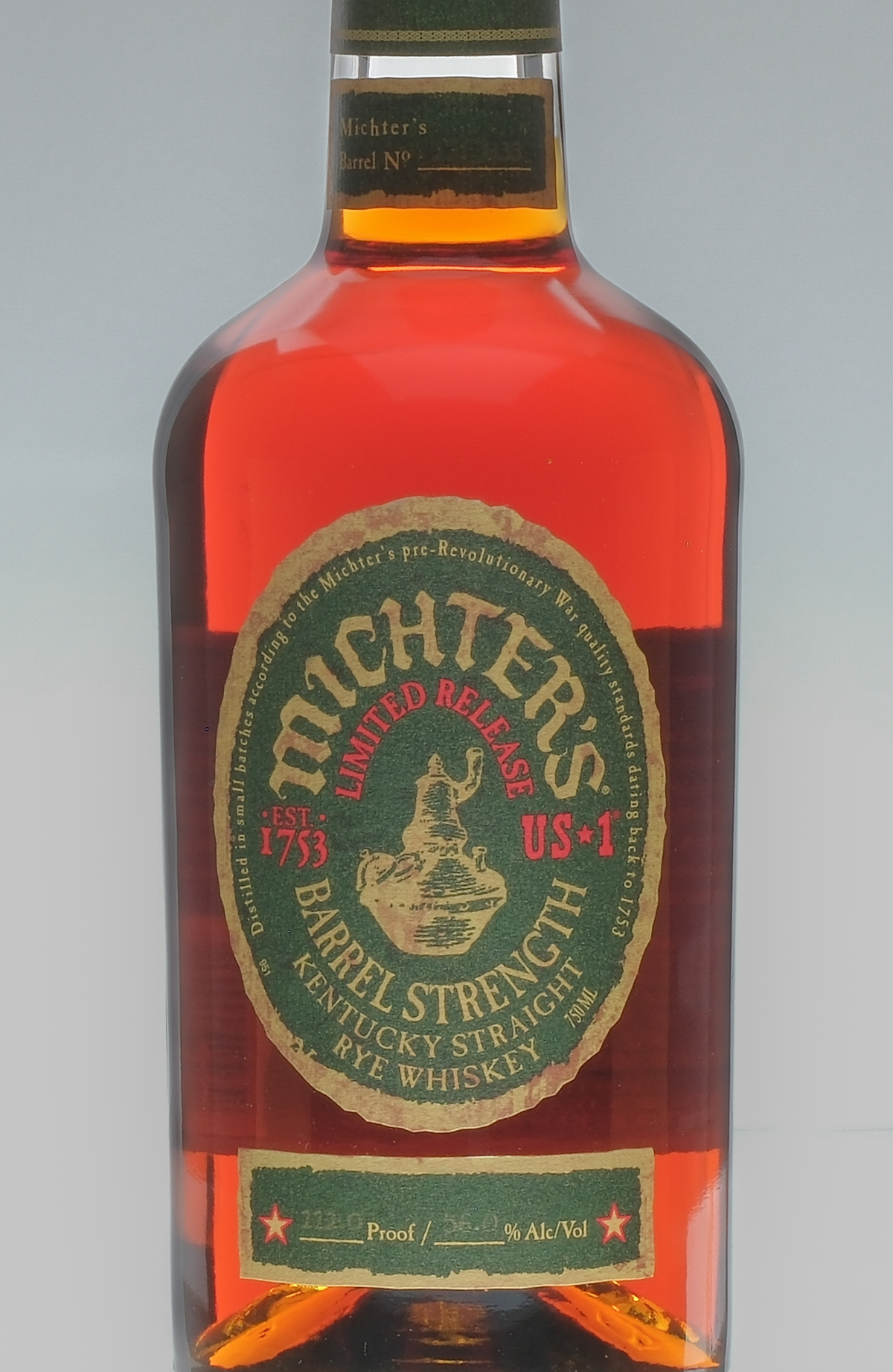 Limited Release. Barrel Strength. Michter’s Barrel No: 22C833. 112 Proof. 56% ALC/VOL. Seals intact. Labels excellent. Whiskey Rye Michter’s Distillery USA Kentucky 2022 1 750ml