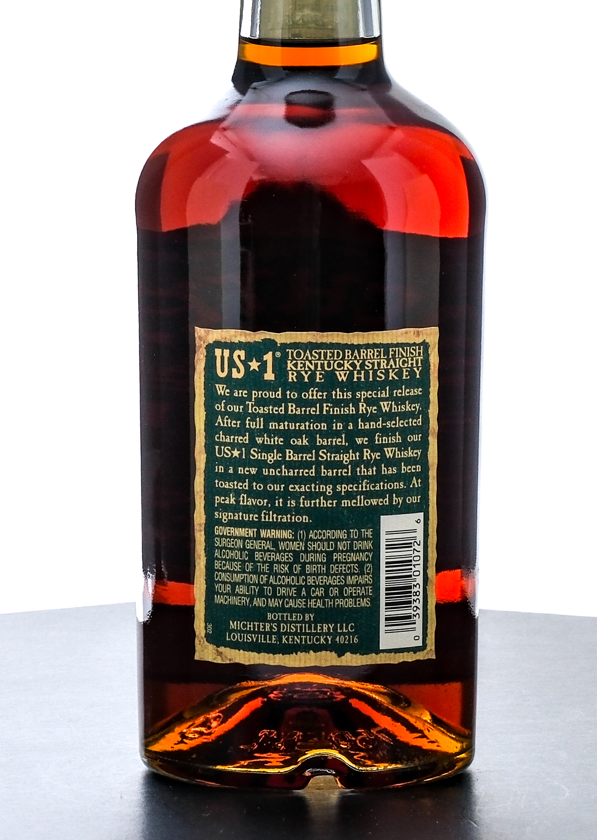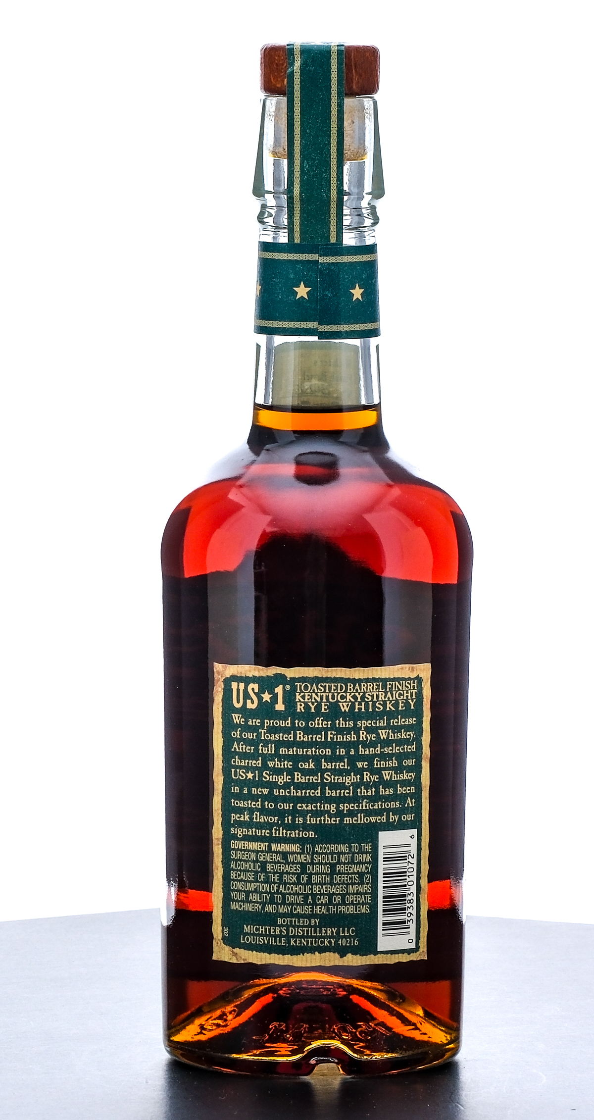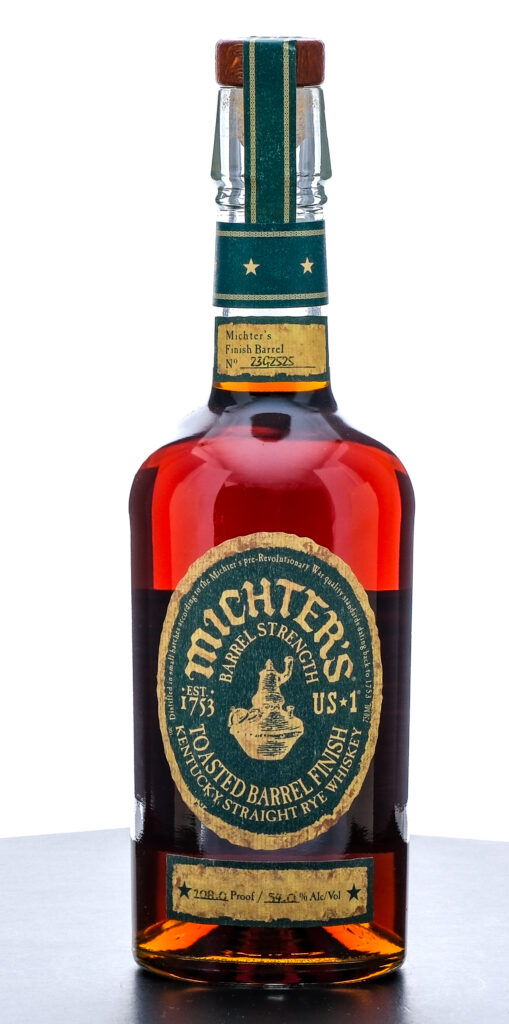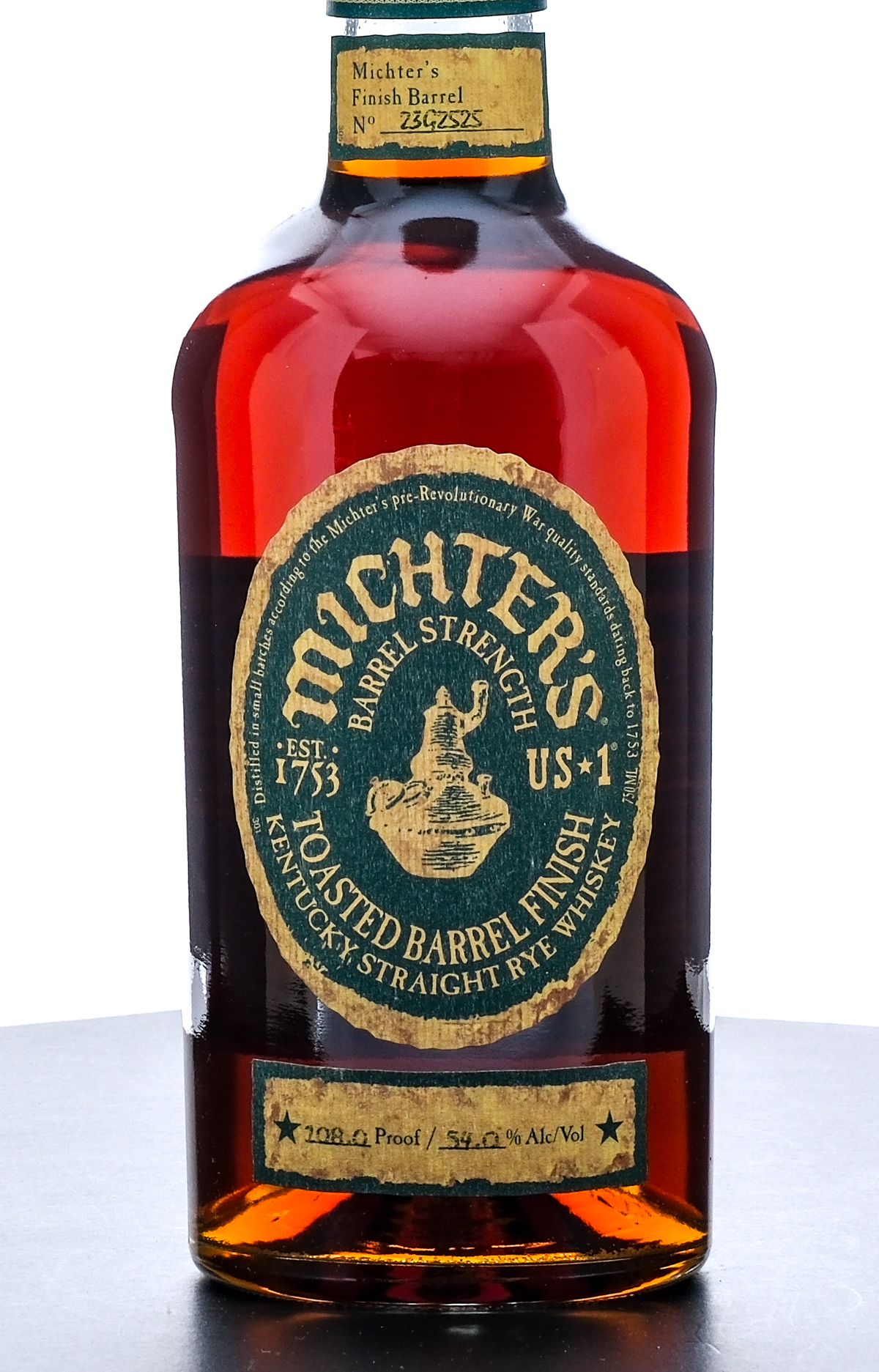 Michter’s US-1 Toasted Barrel Finish Barrel Strength Kentucky Straight Rye Whiskey (2023). Michter’s Finish Barrel No. 23G2525. 54% ALC/VOL (108 Proof). Stamp seal intact, noting a small slice on top of the seal and cork stopper. Printed labels excellent. 750ml. Bottled by Michter’s Distillery.