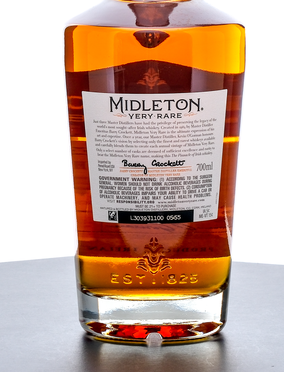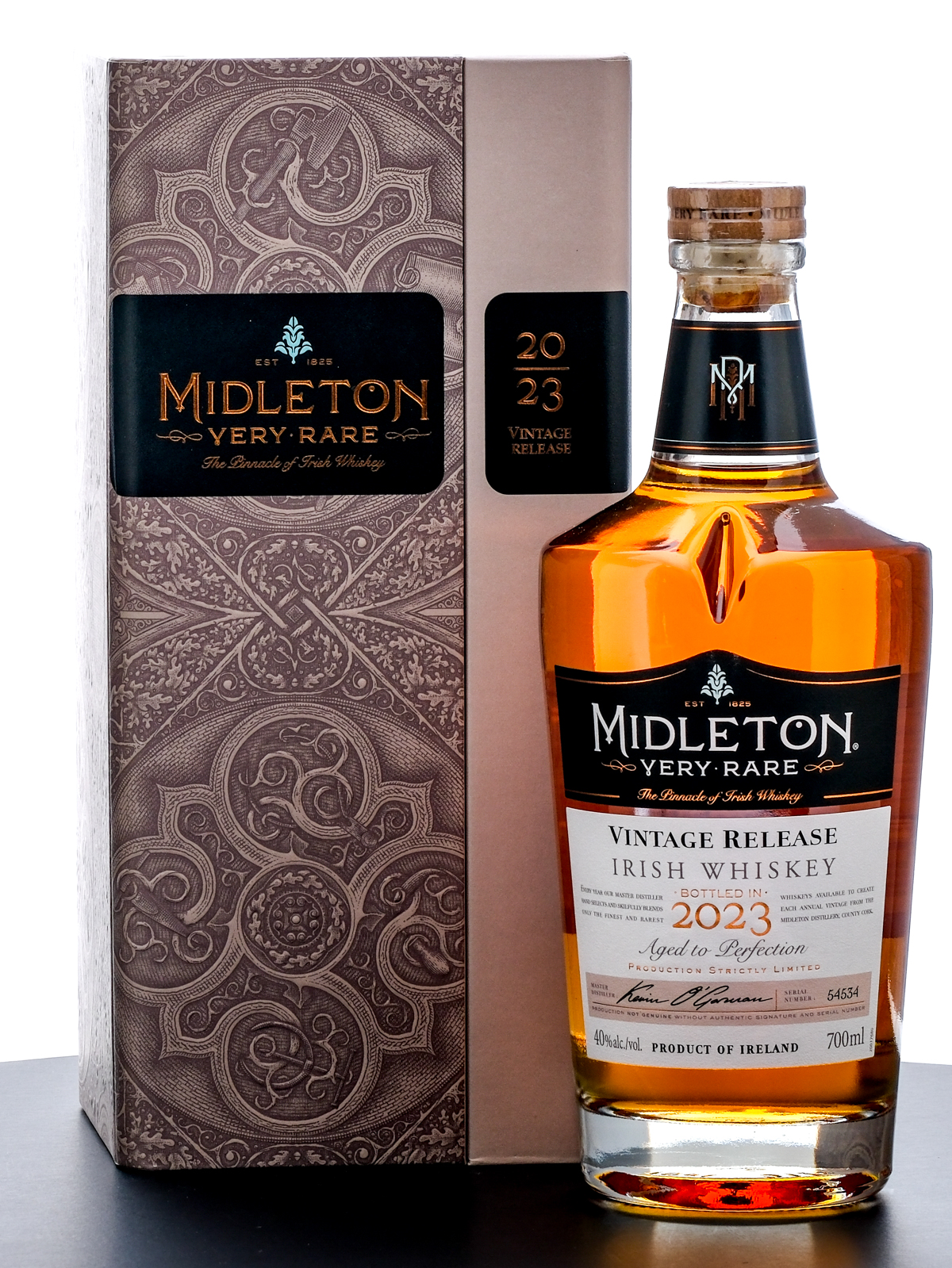 Midleton Very Rare Vintage Release Irish Whiskey (2022). Serial Number 54534. 40% ALC/VOL (80 Proof). Cardboard presentation box excellent. Housed within cardboard shipping box (with handwritten notes in marker on lid and side panel). Includes informational pamphlet. Plastic seal on bottle intact. Printed labels excellent. 700ml. Matured & bottled by Midleton Distillery.