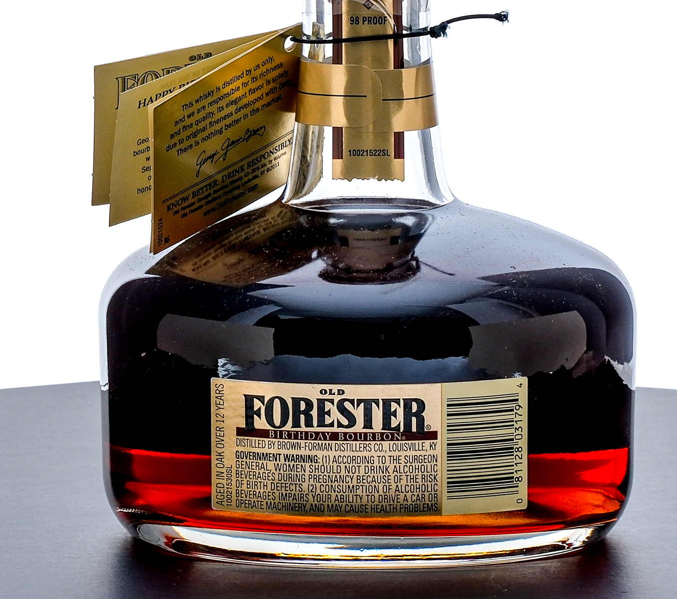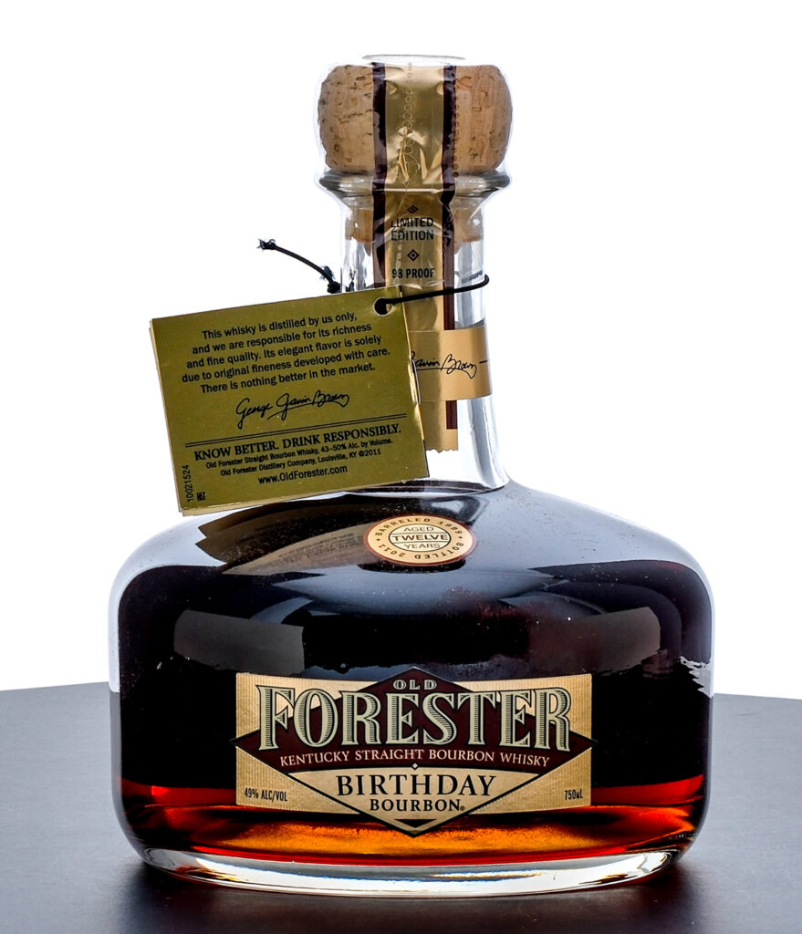 From The Collection of Michael Aronoff: Old Forester Kentucky Straight “Birthday Bourbon” Whisky. Limited Edition. Aged in Oak over 12 years. Barreled 1999. Bottled 2011. 49% ALC/VOL (98 Proof). Plastic/stamp seal and hang tag intact. Printed labels excellent. 750ml. Distilled by Brown-Forman Distillers Co.