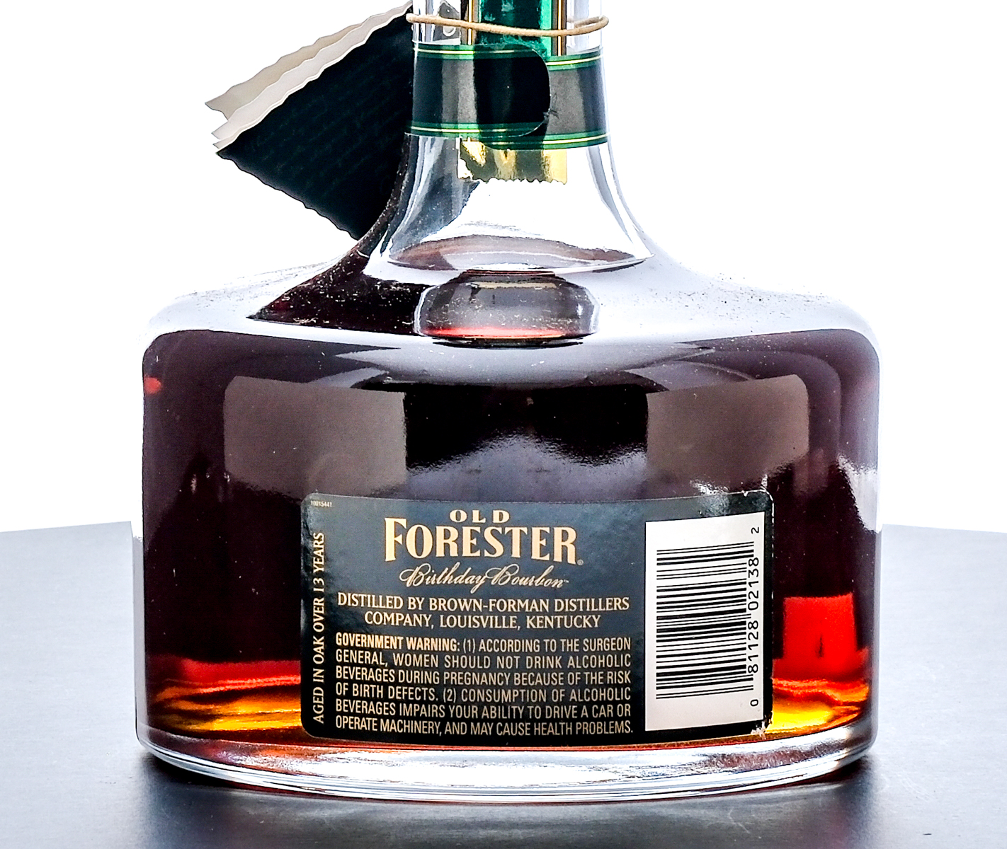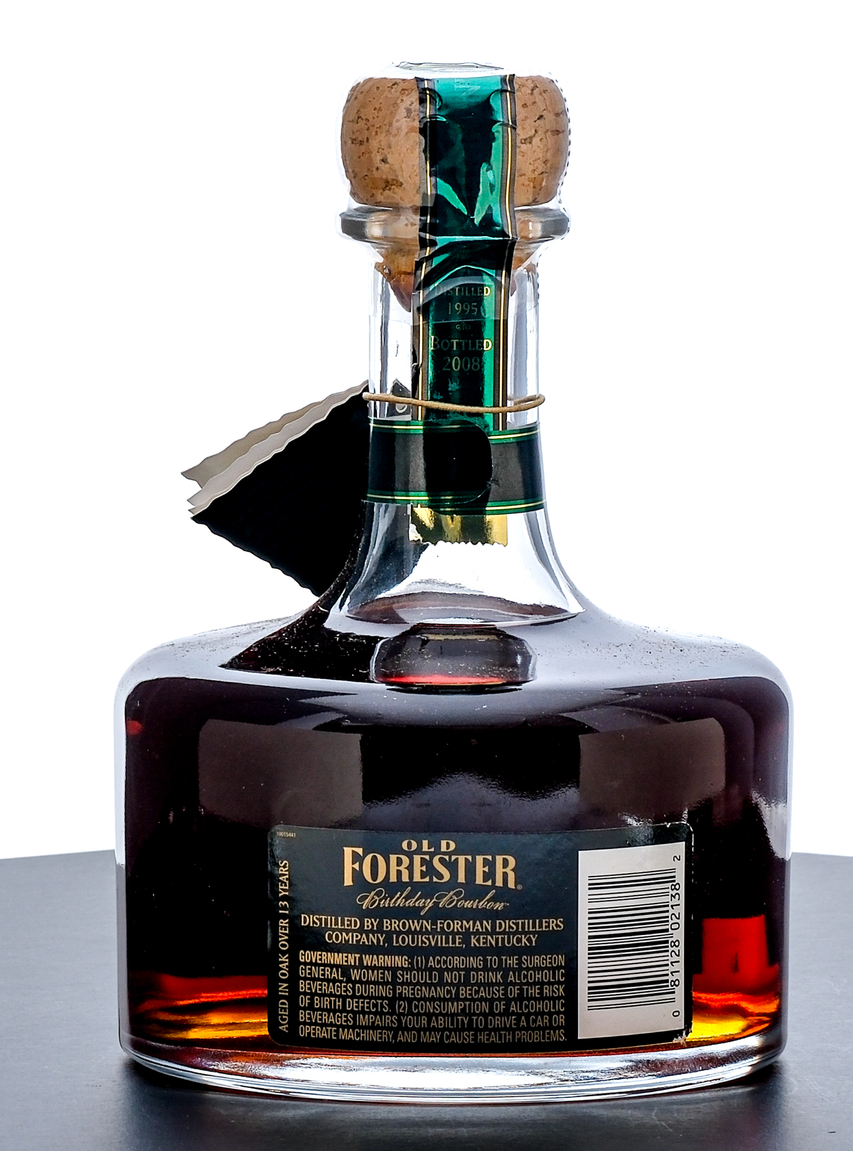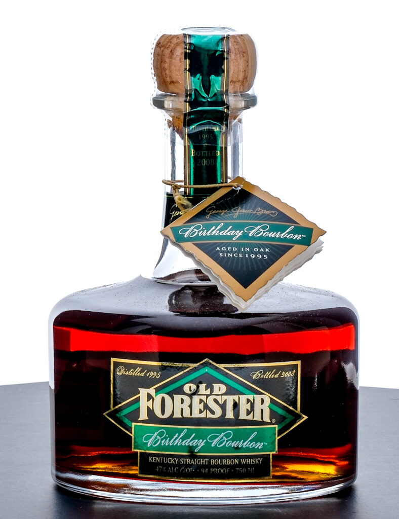 From The Collection of Michael Aronoff: Old Forester Kentucky Straight “Birthday Bourbon” Whisky. Aged in Oak over 13 years. Distilled 1995. Bottled 2008. 47% ALC/VOL (94 Proof). Plastic/stamp seal and hang tag intact. Printed labels very good (front label exhibiting some minor losses and an air bubble trapped beneath the surface from the time of manufacture). 750ml. Distilled by Brown-Forman Distillers Company.