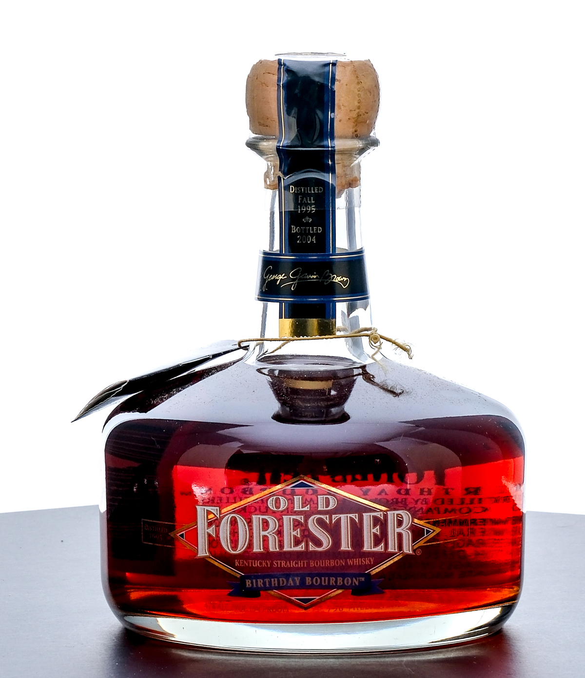 From The Collection of Michael Aronoff: Old Forester Kentucky Straight Bourbon, “Birthday Bourbon”. Aged in Oak for over 8 years. Distilled in 1995 & Bottled in 2004. 47% ALC/VOL (94 Proof). Plastic and paper seal intact. Hang tag also intact. Screen labels excellent. 750ml. Distilled by Brown-Forman Distillers Company, Louisville, Kentucky.